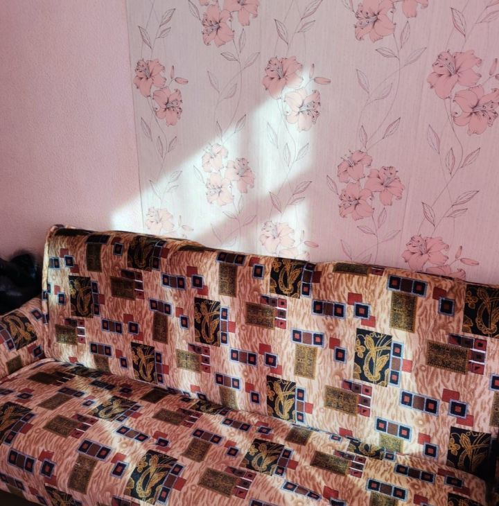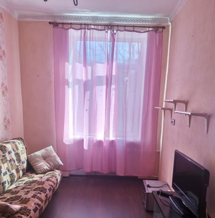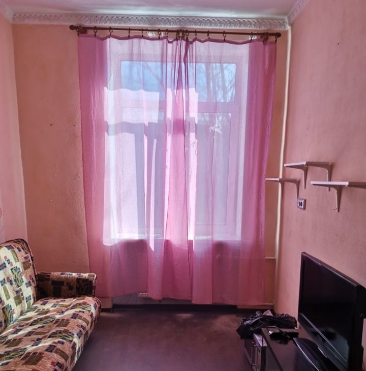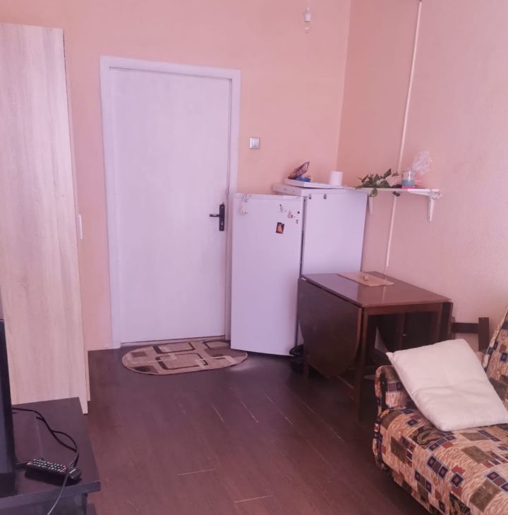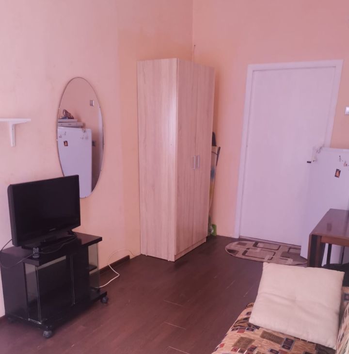В комнате есть вся необходимая для проживания мебель и техника. Диван-книжка раскладной, шкаф для вещей, тумба под телевизор, телевизор, холодильник, стол.В комнате поменяно окно, свежие обои.