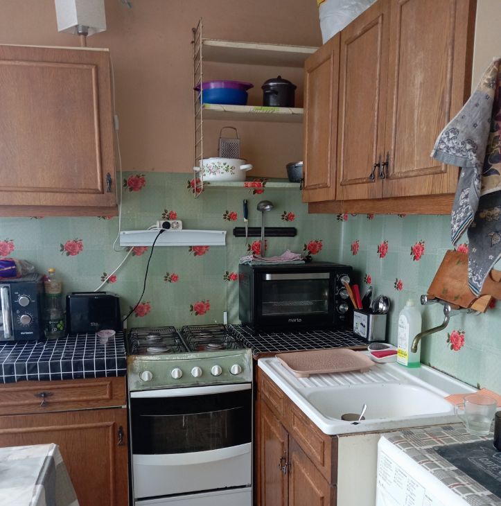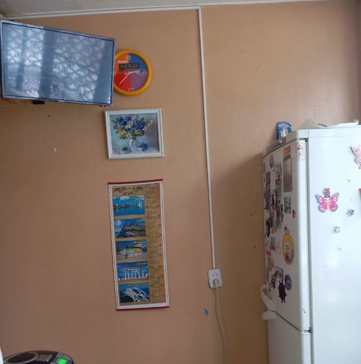 В кухне гарнитур, газовая плита, электрическая печь, микроволновая печь, стиральная машина, холодильник , телевизор, термопот, посуда.