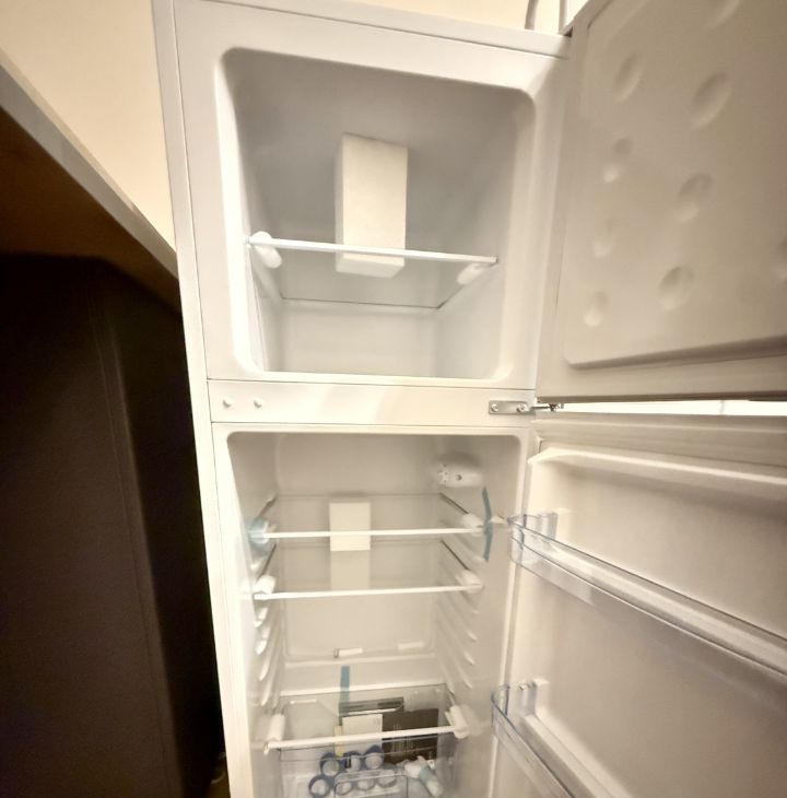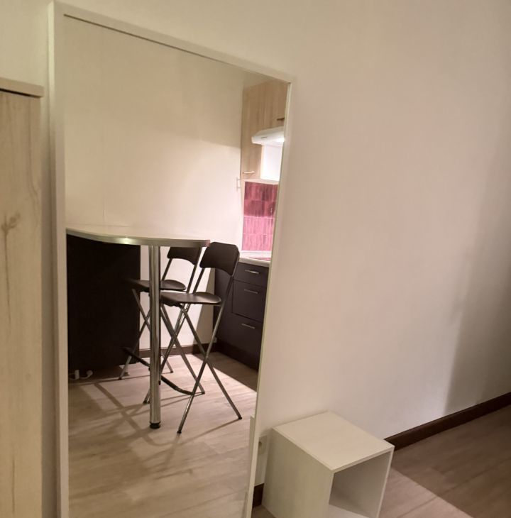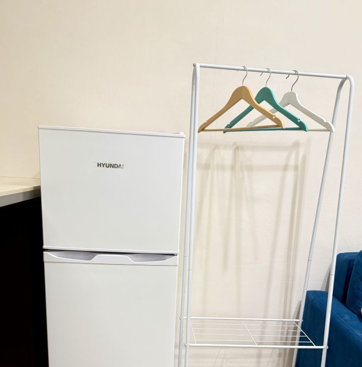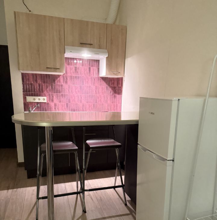 Из мебели - кухня с варочной поверхностью, барная стойка, раскладной диван, комод, шкаф, большое зеркало и новый холодильник.