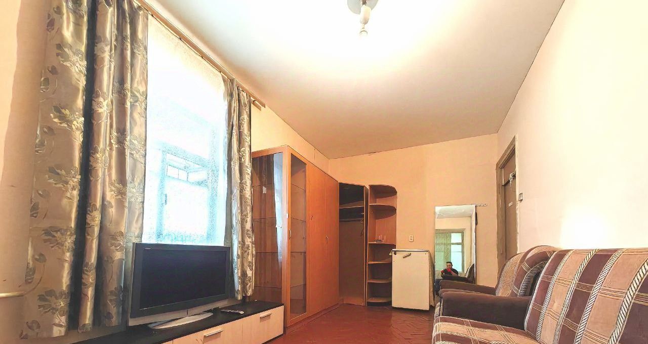 В комнате есть большой шкаф, диван, телевизор, маленький холодильник.