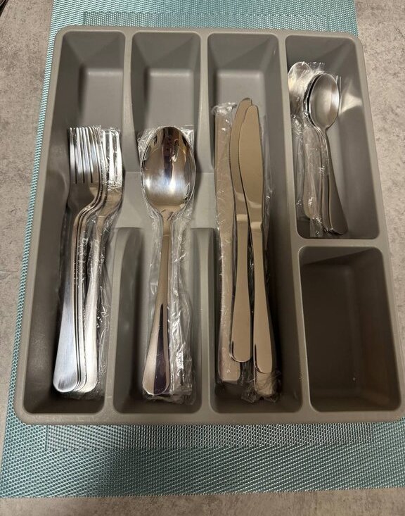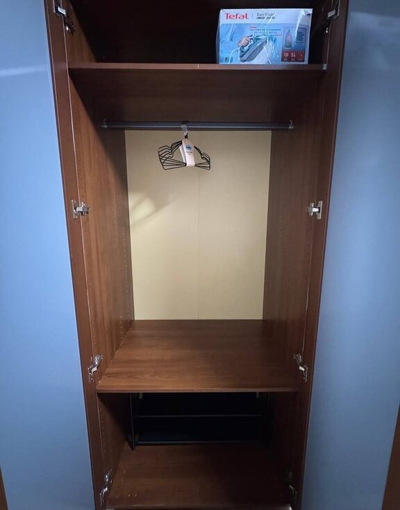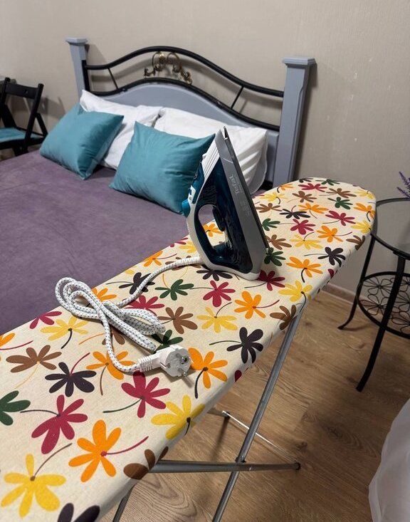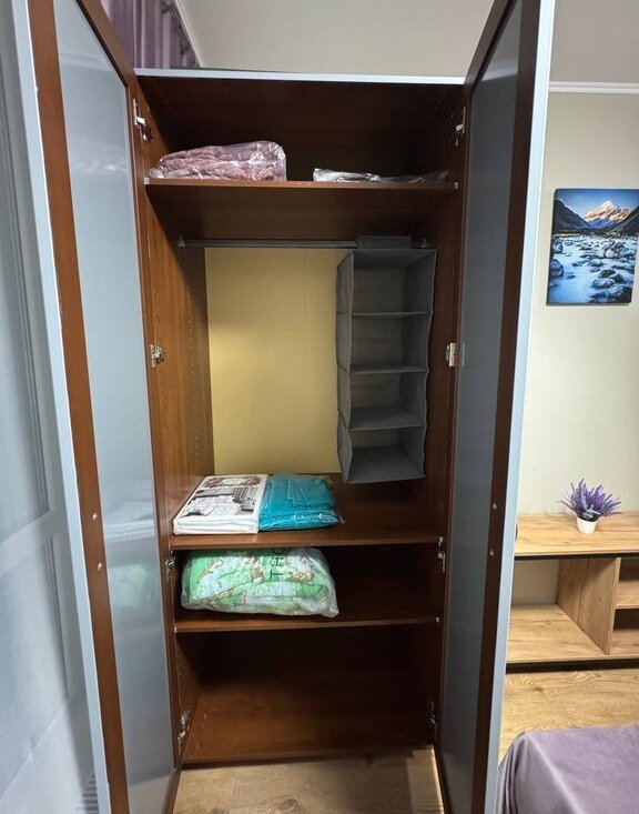 двуспальная кровать, 2 шкафа, кухонный гарнитур(духовки нет), стол, стулья, небольшой холодильник, микроволновка, индукционная плита, чайник. Новая посуда (кастрюля, сковорода, столовые приборы), тарелки, чашки. Новый утюг, гладильная доска. Текстиль тоже новый. (постельное белье, полотенца). Есть одеяло и подушки.