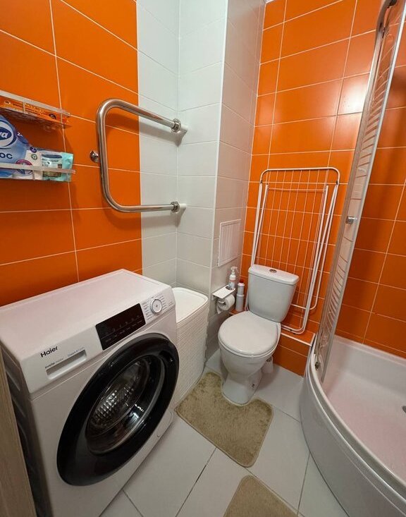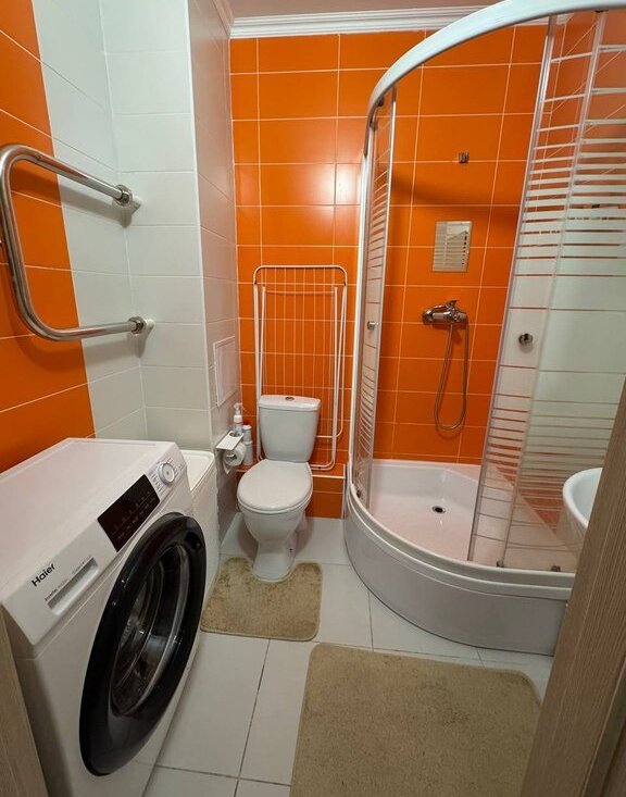 Санузел совмещенный, душ, стиральная машина. Вместительная вешалка.