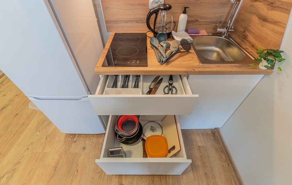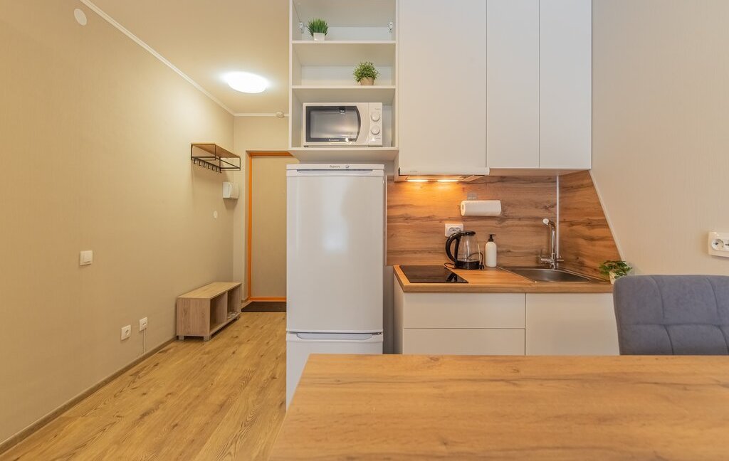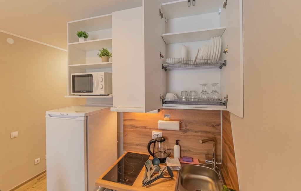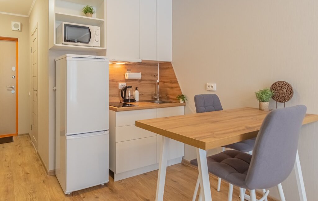 - обеденная зона (холодильник, чайник, микроволновка, плита, столовая группа, посуда на 2 персоны, барная стойка со стульями)