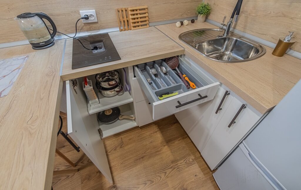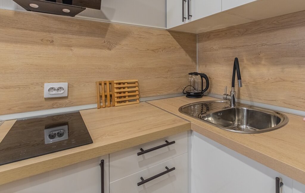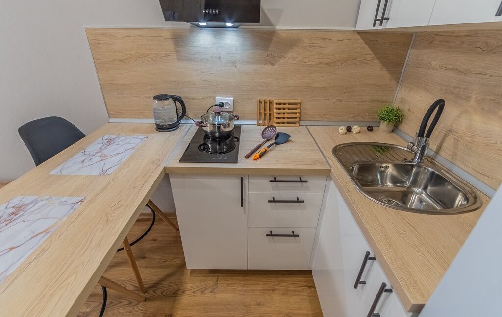 - обеденная зона (холодильник, чайник, микроволновка, плита, столовая группа, посуда на 2 персоны, стол со стульями)