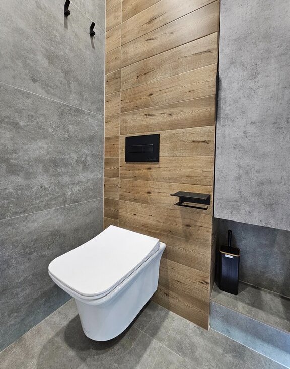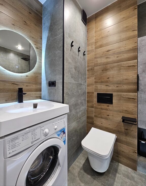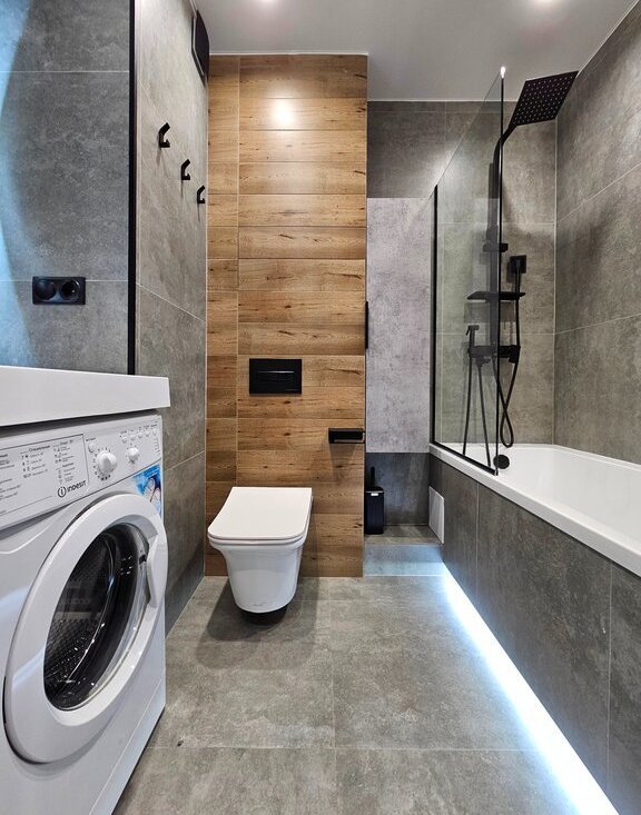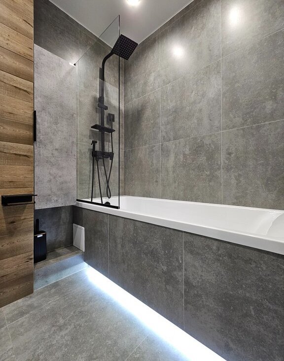 Санузел совмещенный. Ванна. Сделана светодиодная подсветка. Вместо полотенцесушителя - "теплая стена". Вместительный пенал для хранения. Пол с подогревом.