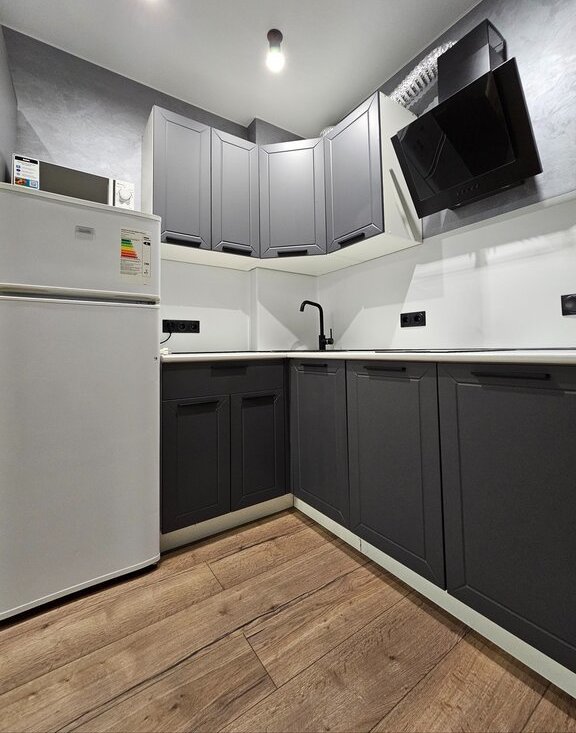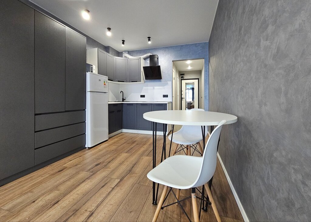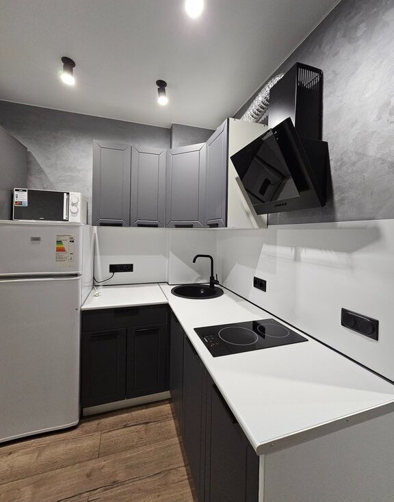 В кухонной зоне установлен встроенный гарнитур с вытяжкой и варочной поверхностью. Двухкамерный холодильник, микроволновая печь.