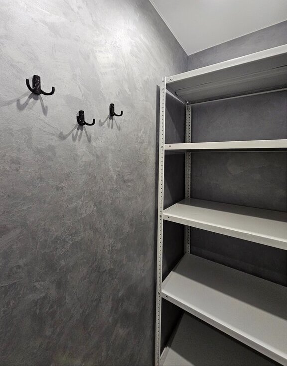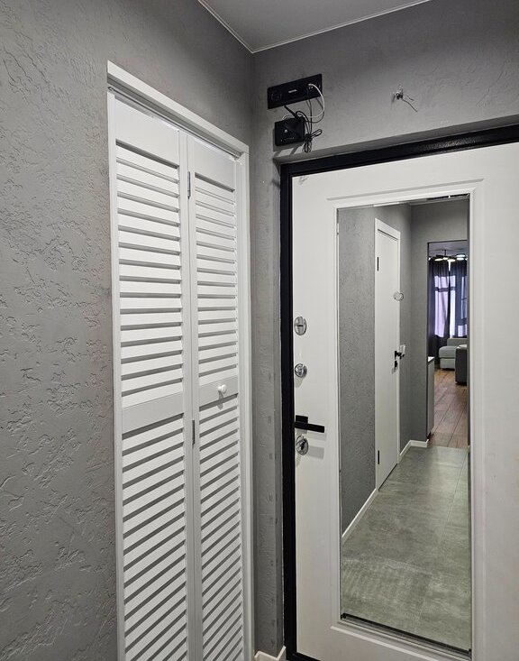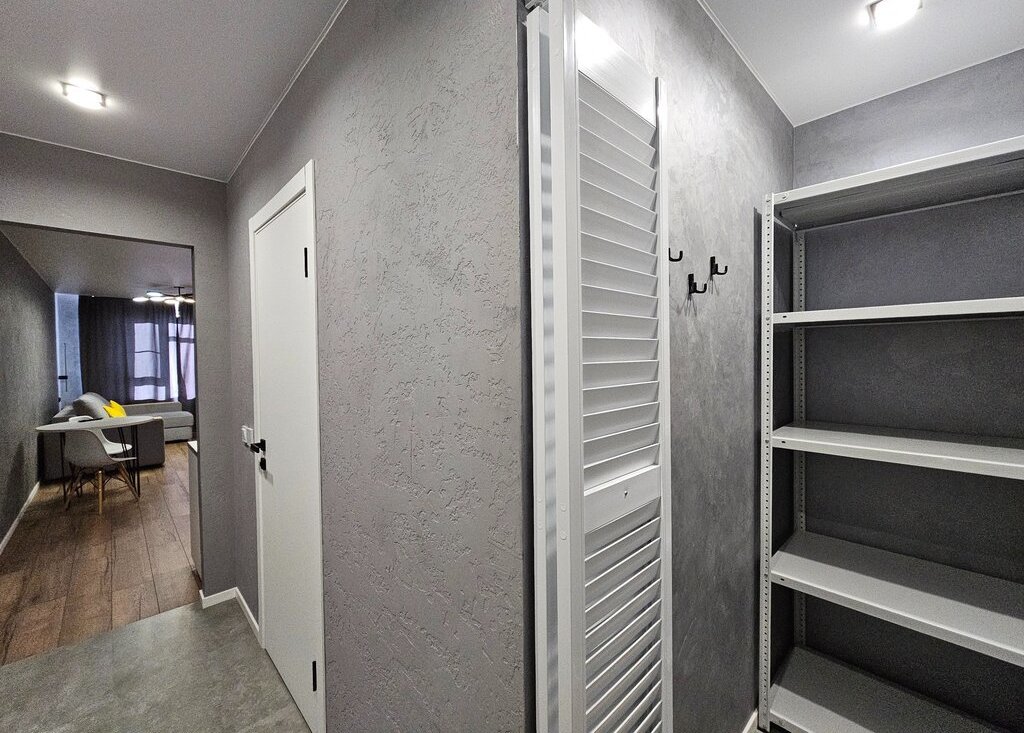 В квартире очень много мест для хранение: в комнате вместительный шкаф, в прихожей оборудована гардеробная комната.
