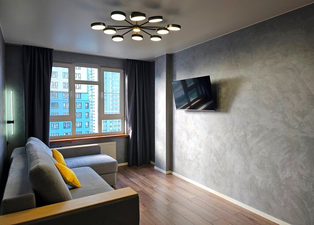 Удобный раскладной диван. Рядом с диваном расположен стильный светильник и розетки. Новый телевизор с функцией подключения к интернету. Интернет подключен. Имеется WiFi роутер.