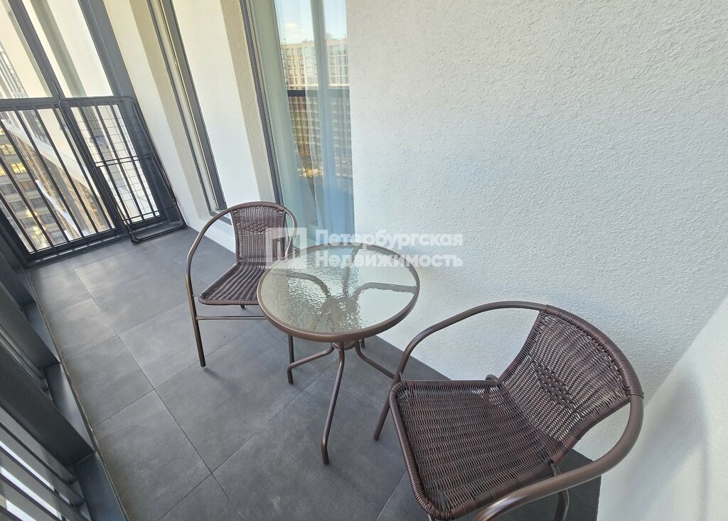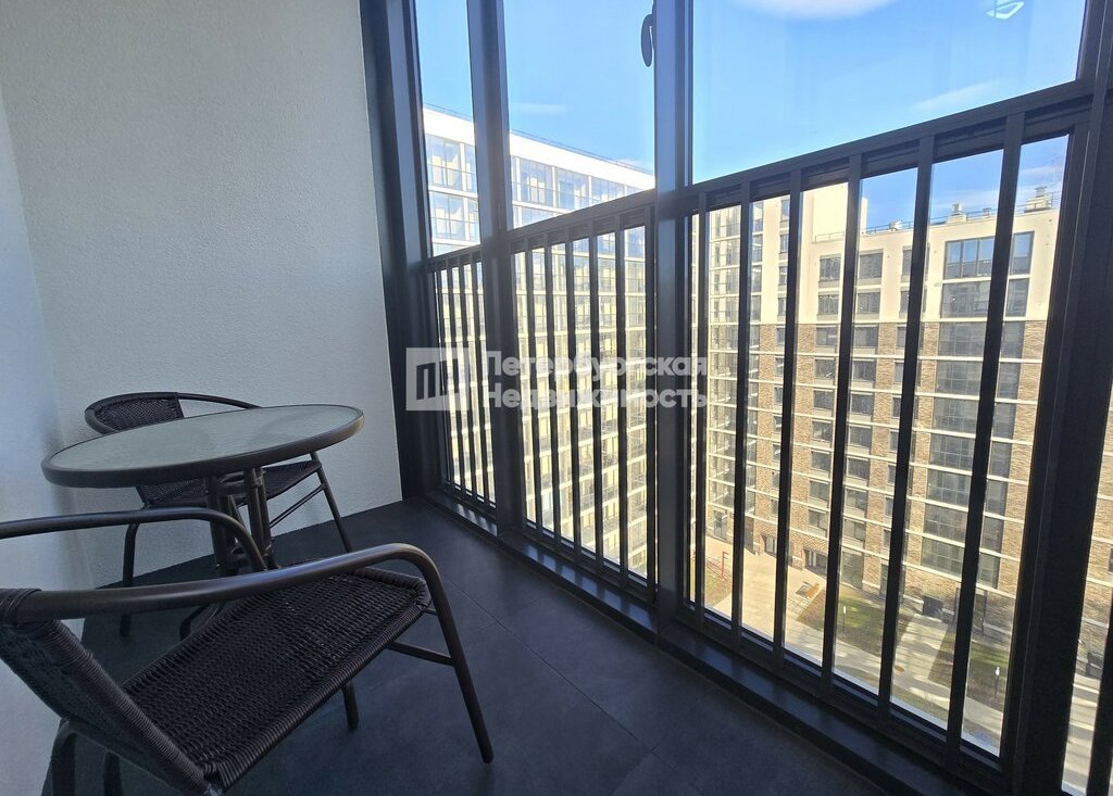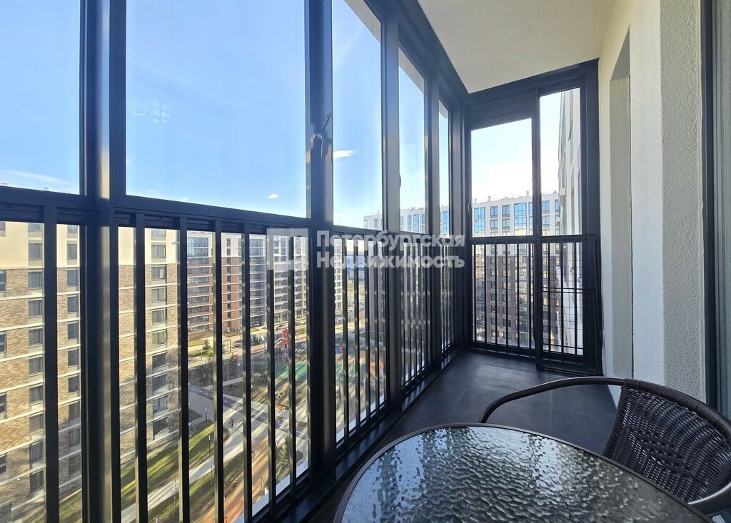 Квартира расположена на комфортном 8 этаже и впервые сдаётся — вы будете первым жильцом. Просторная студия с удачной планировкой: светлая комната 18 м2 с двумя окнами наполняется естественным светом, вместительный коридор 3 м2 обеспечивает удобное хранение вещей, а совмещённый санузел оснащён тёплыми полами. Особое внимание заслуживает большая лоджия 5,4 м2 с панорамным остеклением — уютное место для отдыха, где уже размещены кресла и стол.