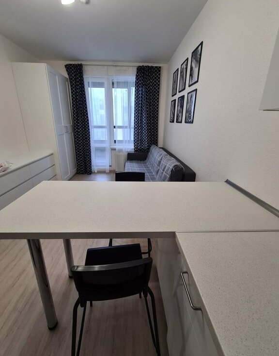 Сдается уютная студия на длительный срок на 17 этаже в кирпично-монолитном доме. Квартира полностью укомплектована всей необходимой мебелью и техникой. Есть пассажирский и грузовой лифты. Просторная лоджия с остеклением.