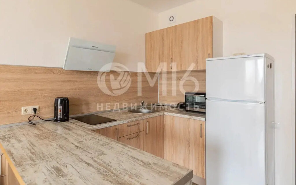 Полноценная кухня: холодильник, варочная панель, вытяжка, микроволновка, обеденная зона.
