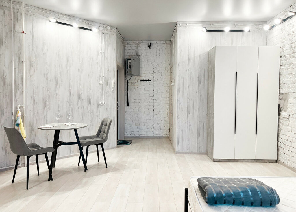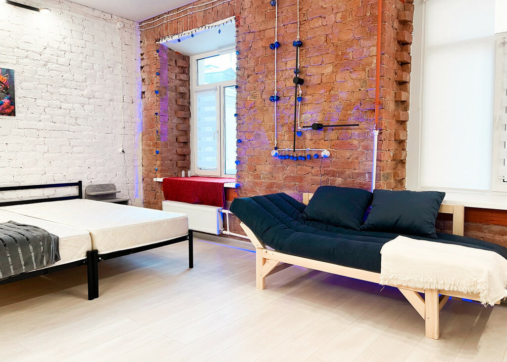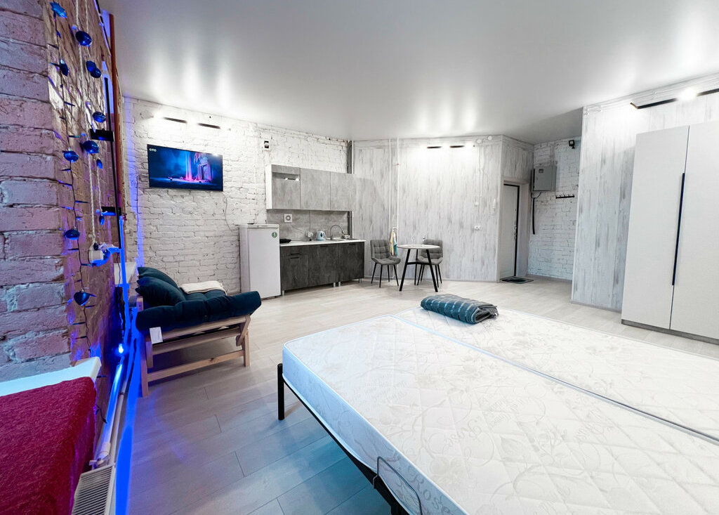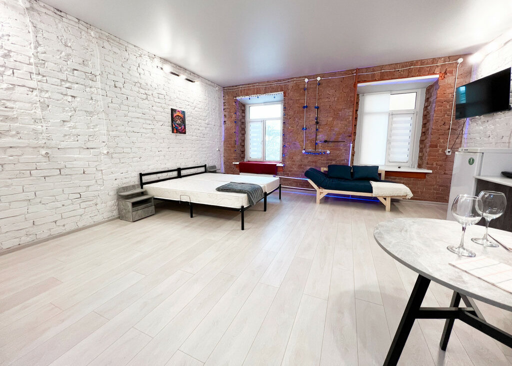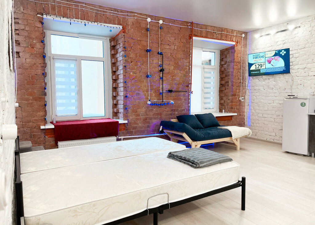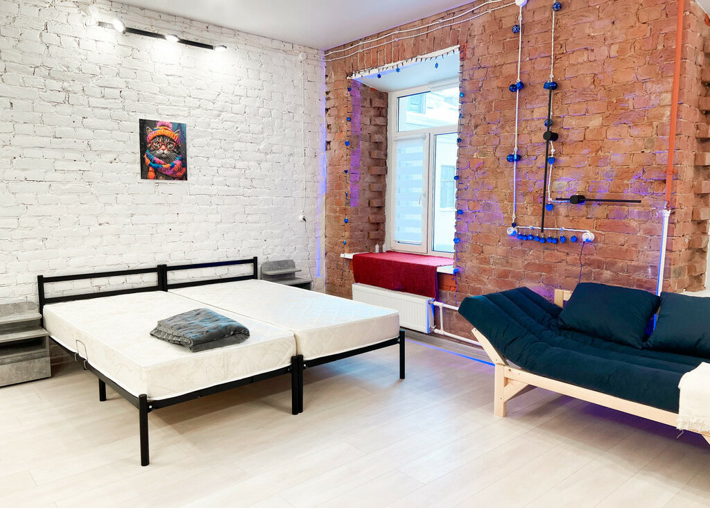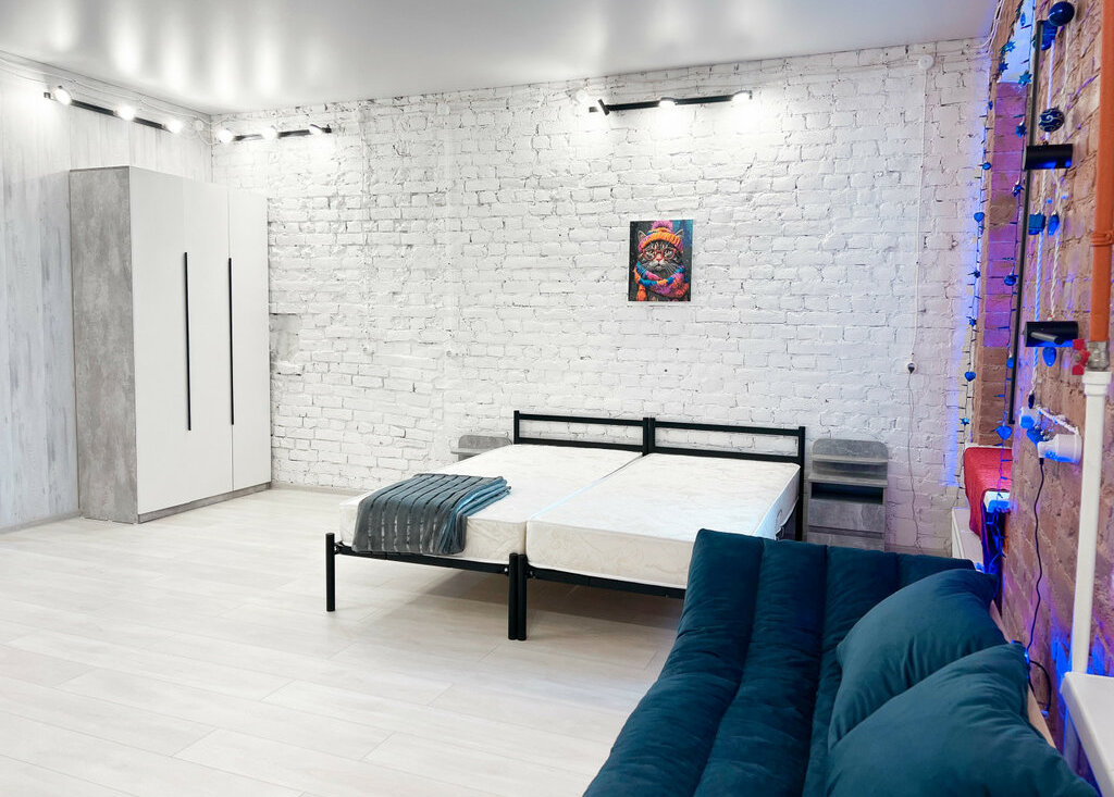 При необходимости кровать делится на два раздельных спальных места. В студии два окна, оба выходят в тихий двор, одно из них на открытое пространство (не окна в окна).