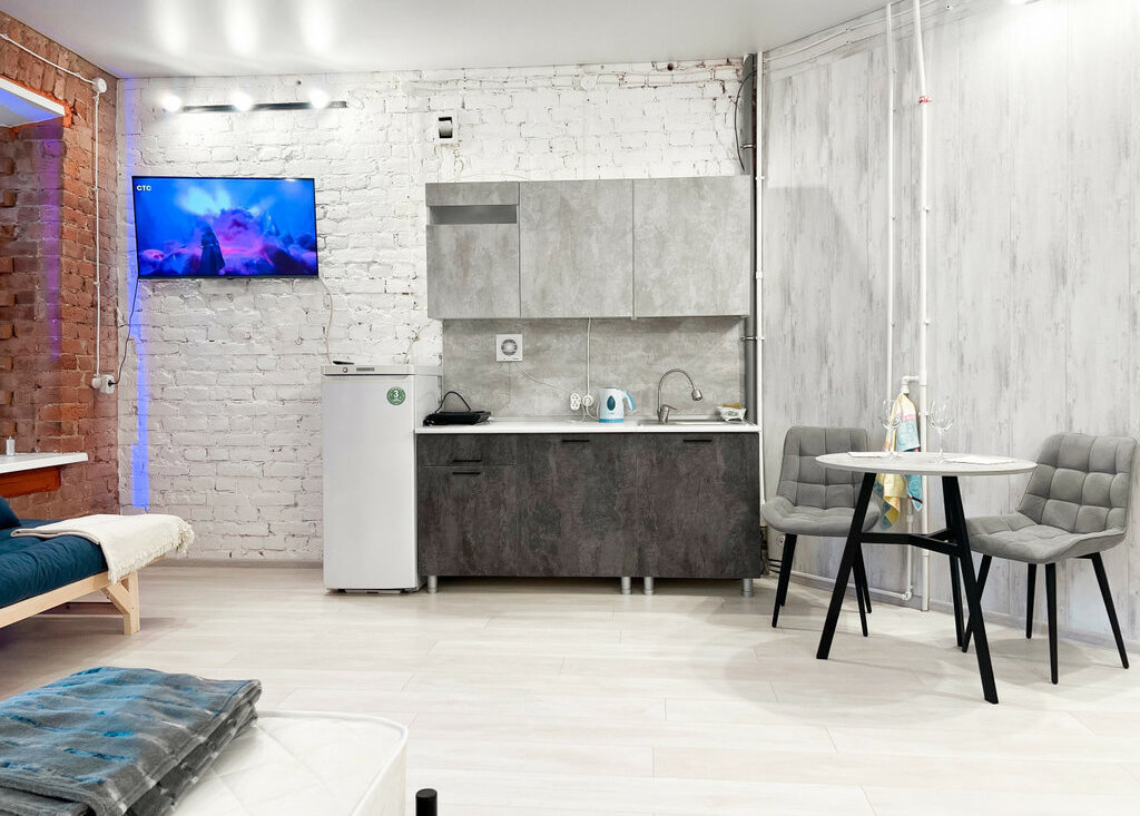 - кухонная техника (микроволновка, чайник, холодильник с морозилкой, плита);