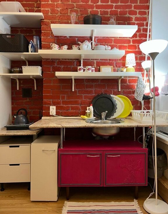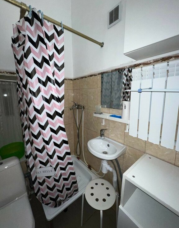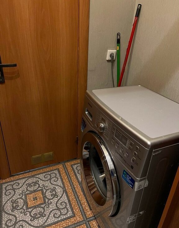 Диван раскладной, индукционная плита, холодильник, СВЧ, посуда, утюг, гладильная доска, сушилка, стиральная машинка.