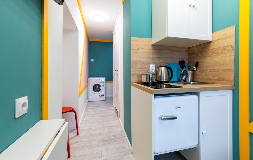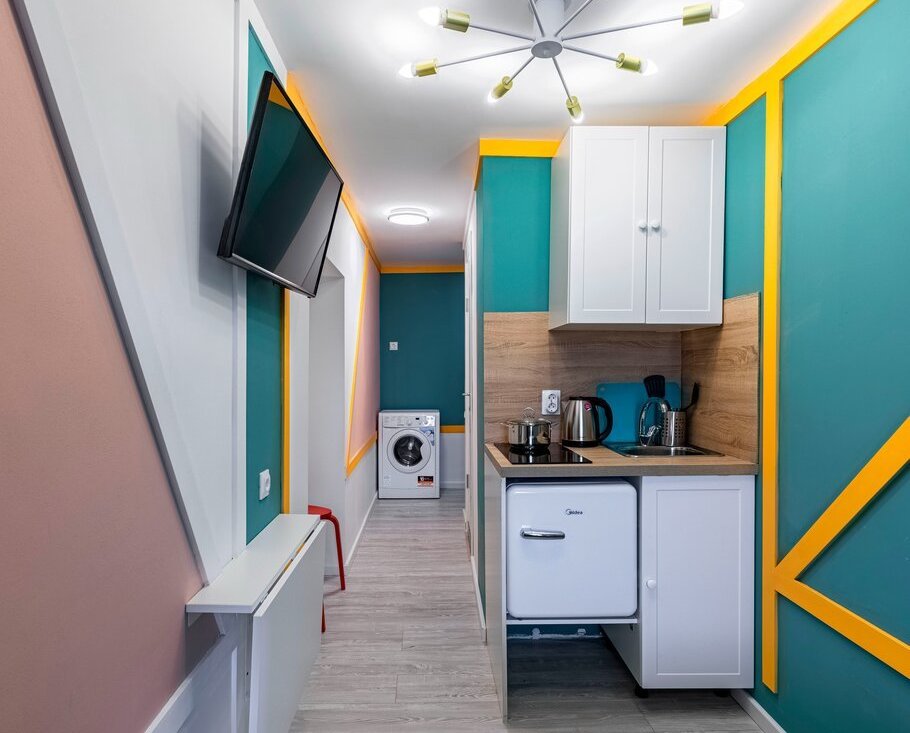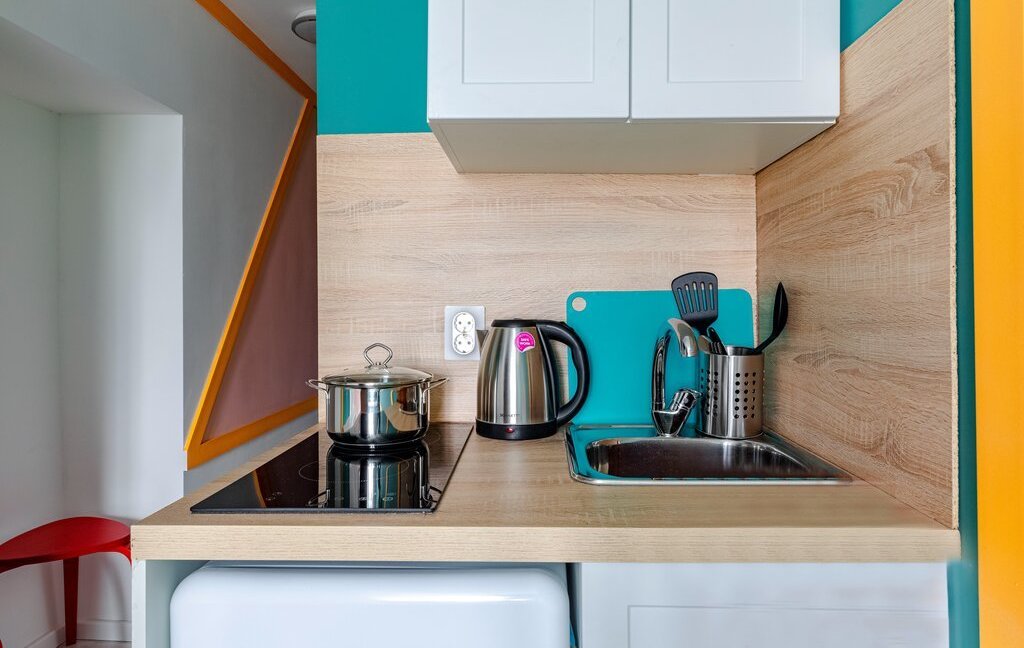 - Coбcтвeннaя кухня (pакoвинa, плита, xoлодильник, электрический чайник, посуда)