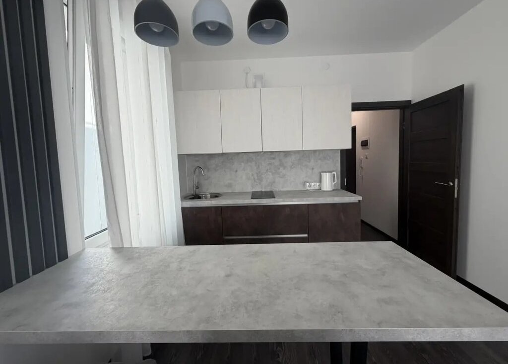 В квартире выполнен качественный евроремонт. Пространство студии продумано до мелочей: есть вся необходимая мебель на кухне и в комнате для комфортного проживания. Из техники — холодильник, телевизор и стиральная машина. Ванная комната оборудована душевой кабиной. Изюминкой квартиры является просторная лоджия, где можно расслабиться после рабочего дня.