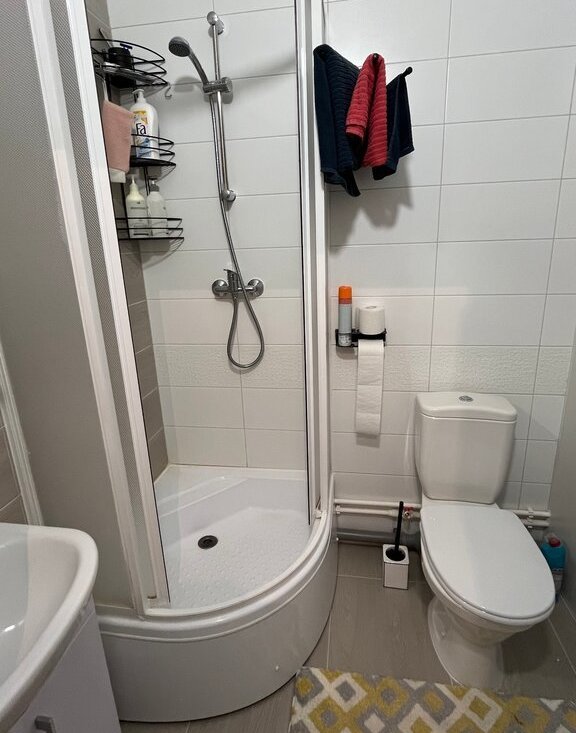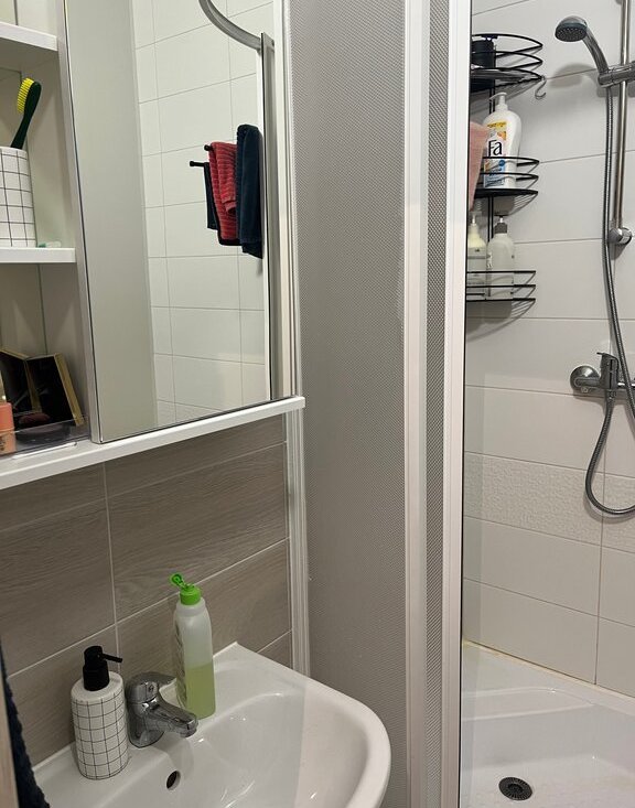 · Санузел с душевой кабиной, раковиной, унитазом, стирально-сушильной машиной.