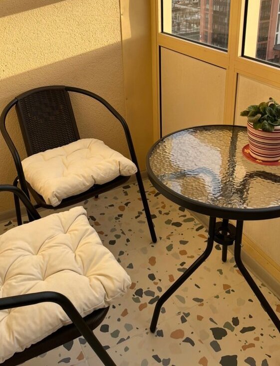 · Мебель: кровать, стеллаж для книг, рейл для одежды, стулья со столиком на балконе.