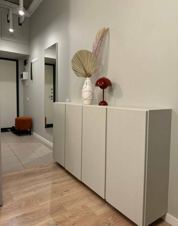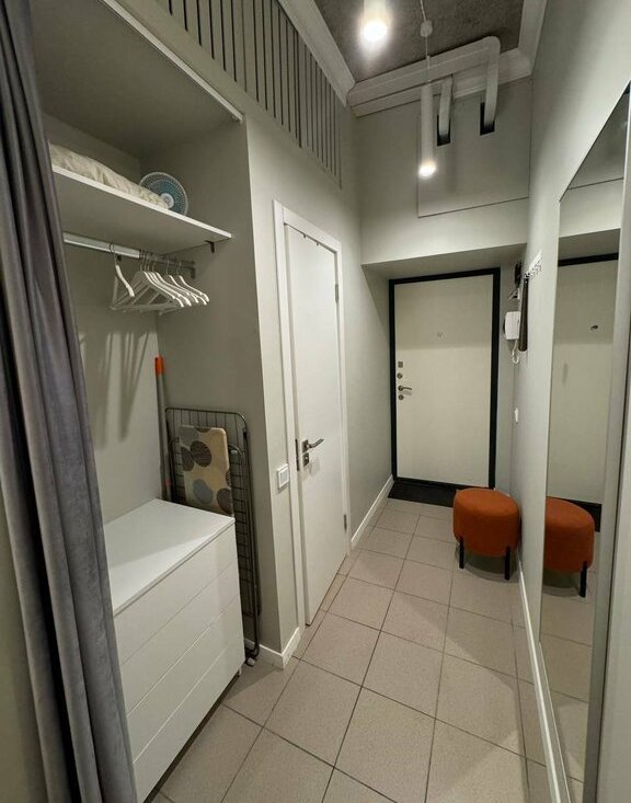 Встроенный шкаф в прихожей, 2 шкафчика в комнате, вместительная антресоль над ванной;