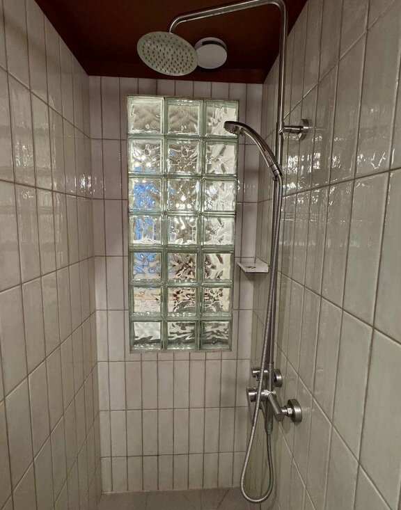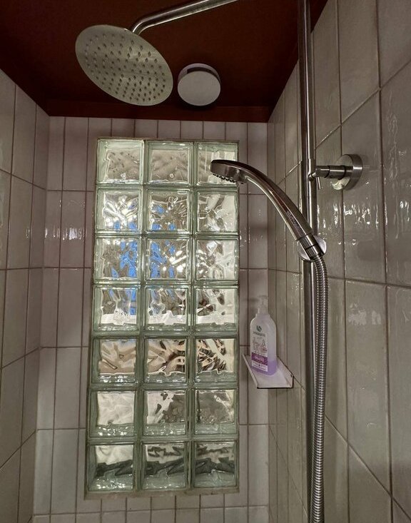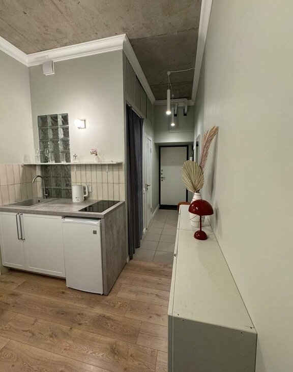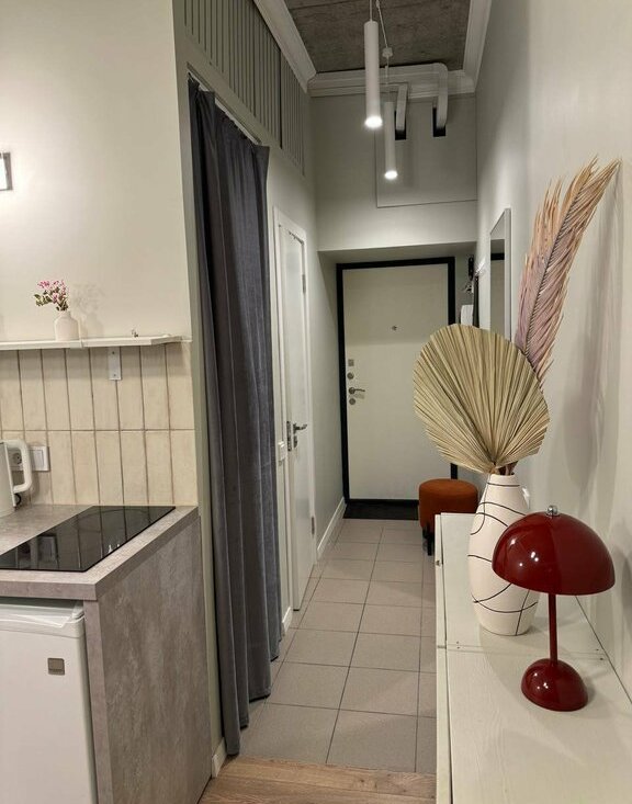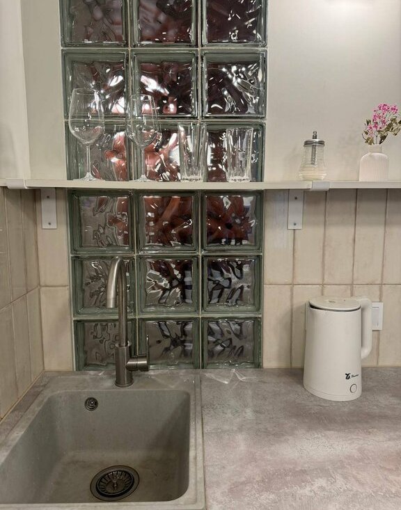 Добавлено много освещения, высокие потолки 3,2м, красивая стеклянная стена в части кухни/душевой.