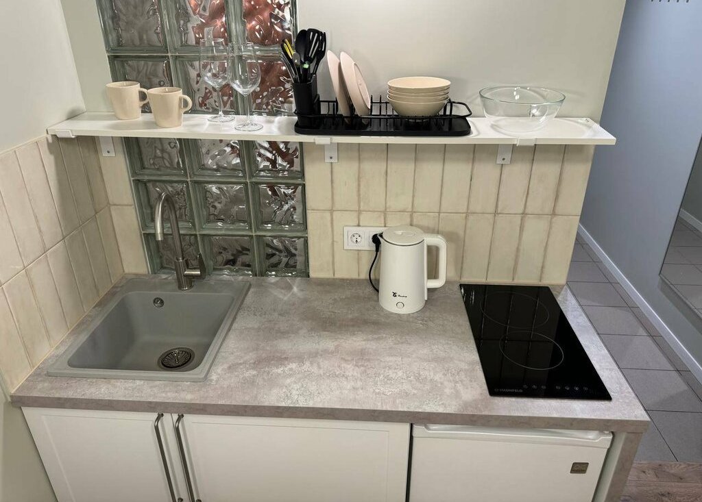- кухня с холодильником, микроволновкой, индукционной плитой, электрочайником и всей необходимой посудой (для приготоволения и сервировки) -стиральная машина . -тропический душ в ванной