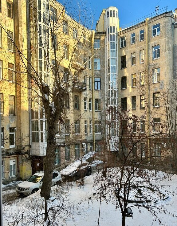 Окна выходят в тихий и зеленый двор.