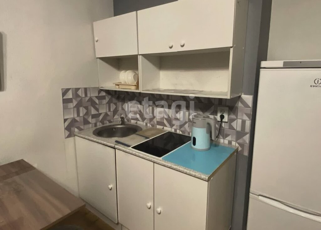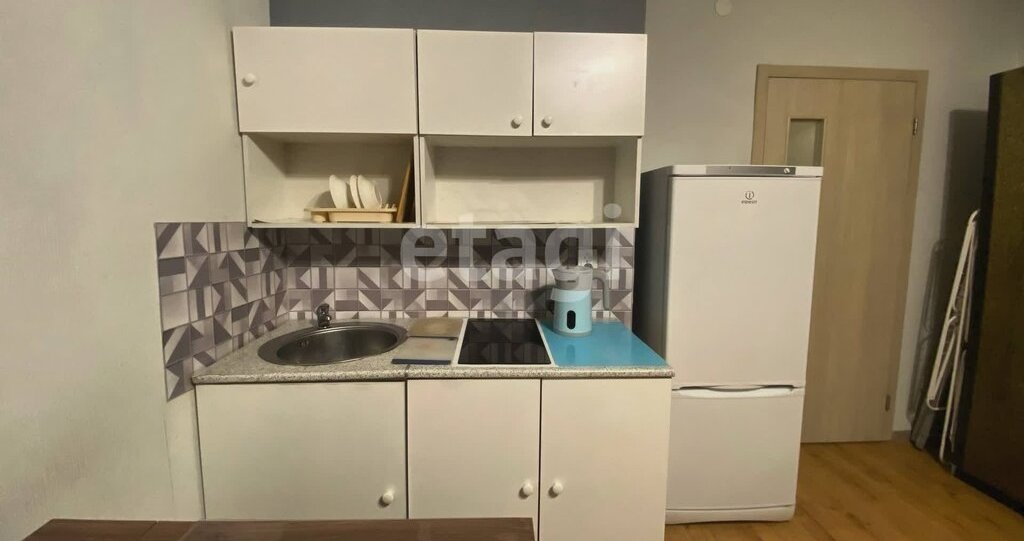 Кухонный уголок оснащен укомплектованным гарнитуром с варочной поверхностью, вместительным холодильником и даже чайником.