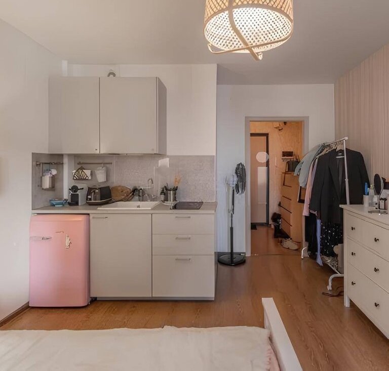 В студии есть кухня, холодильник, стиральная машина, двухспальная кровать, телевизор и вся необходимая техника для комфортной жизни.