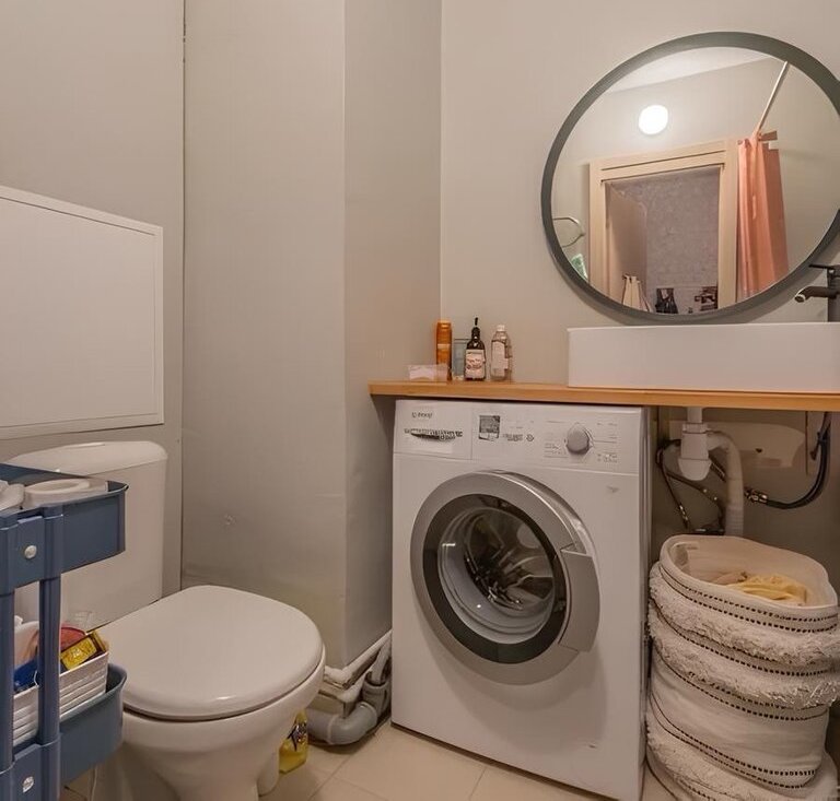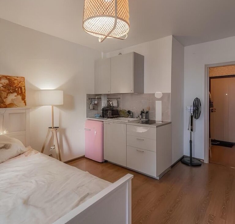 В студии есть кухня, холодильник, стиральная машина, двухспальная кровать, телевизор и вся необходимая техника для комфортной жизни.