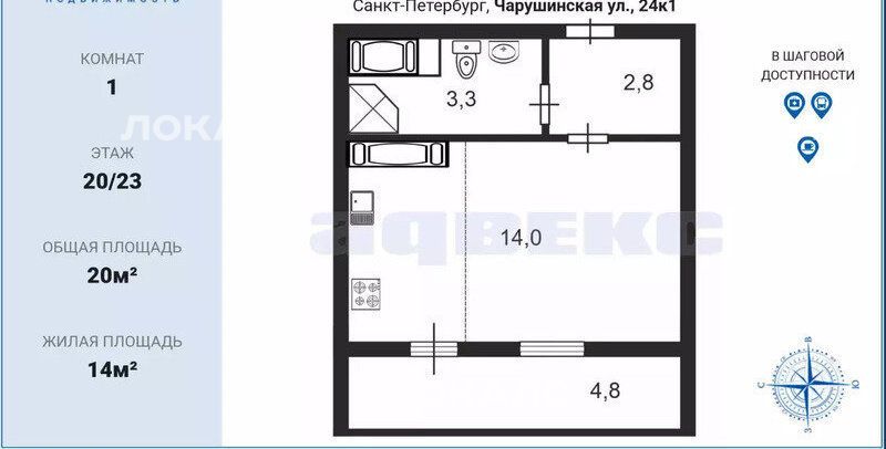 Квартира-студия: Санкт-Петербург, Чарушинская улица, 24к1 (20 м²)