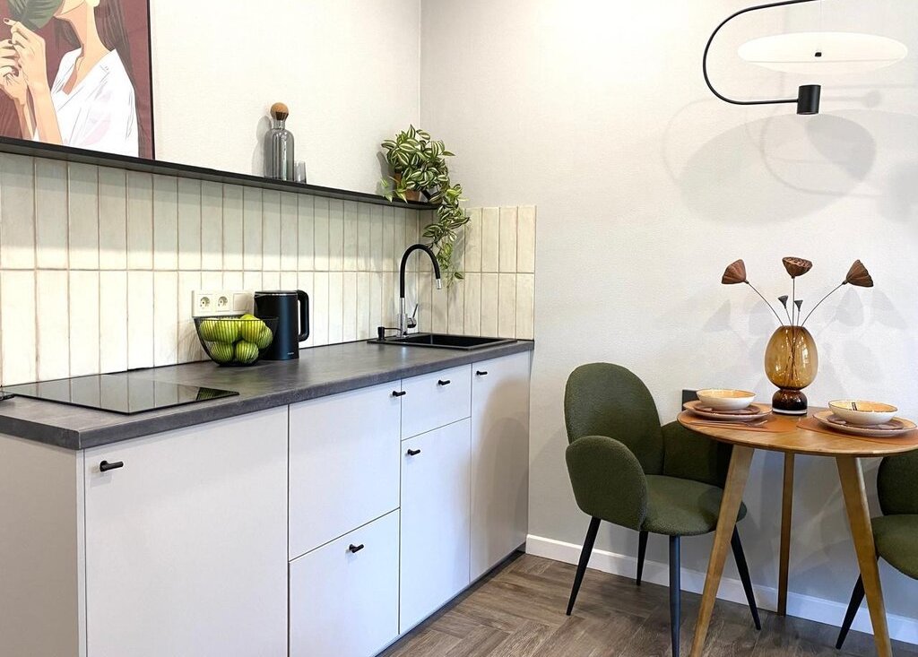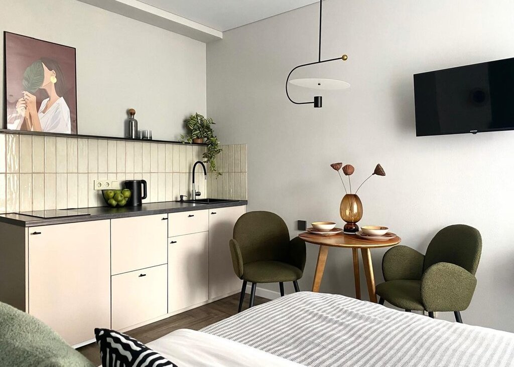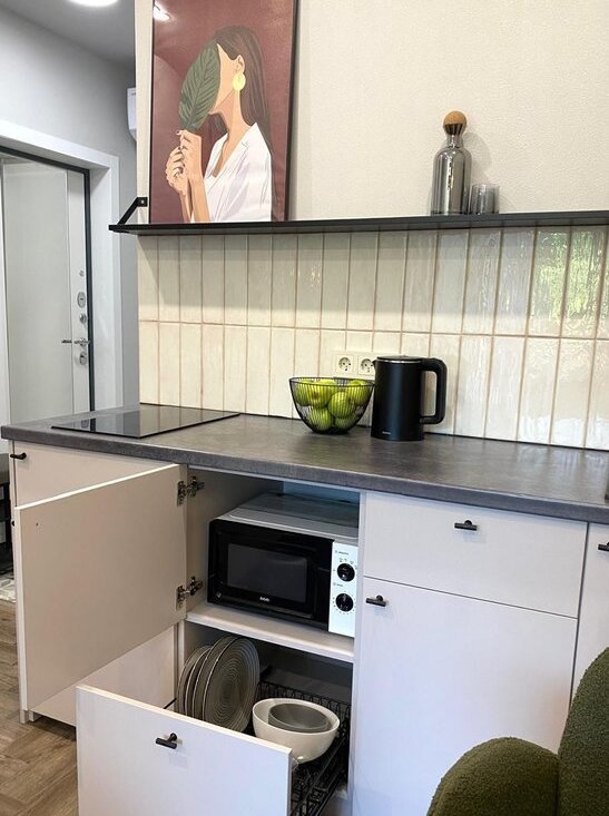- Кухонный гарнитур (микроволновая печь, индукционная варочная плита на 2