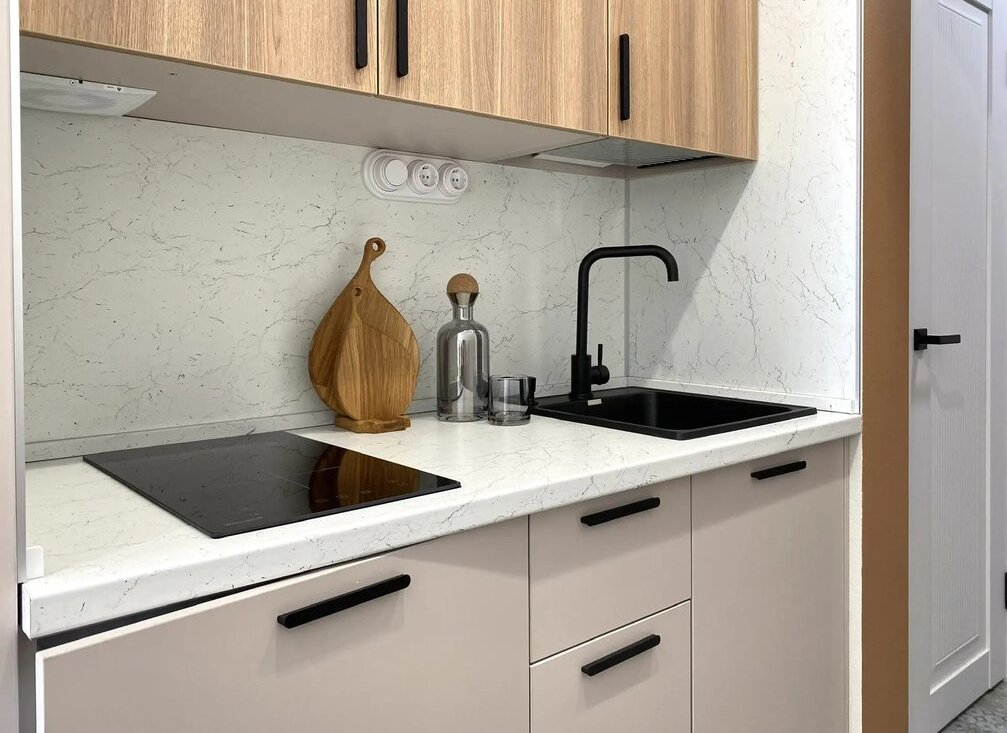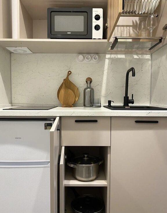 - Кухонный гарнитур (микроволновая печь, индукционная варочная плита на 2