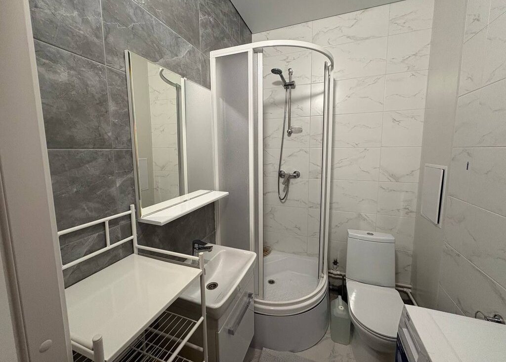 Совмещенный санузел выполнен в современном стиле с душевой кабиной. В комнате -удобная большая кровать с ортопедическим матрасом, кухонный гарнитур, обеденная зона и места хранения. Из окон открывается вид на закрытый от машин двор.