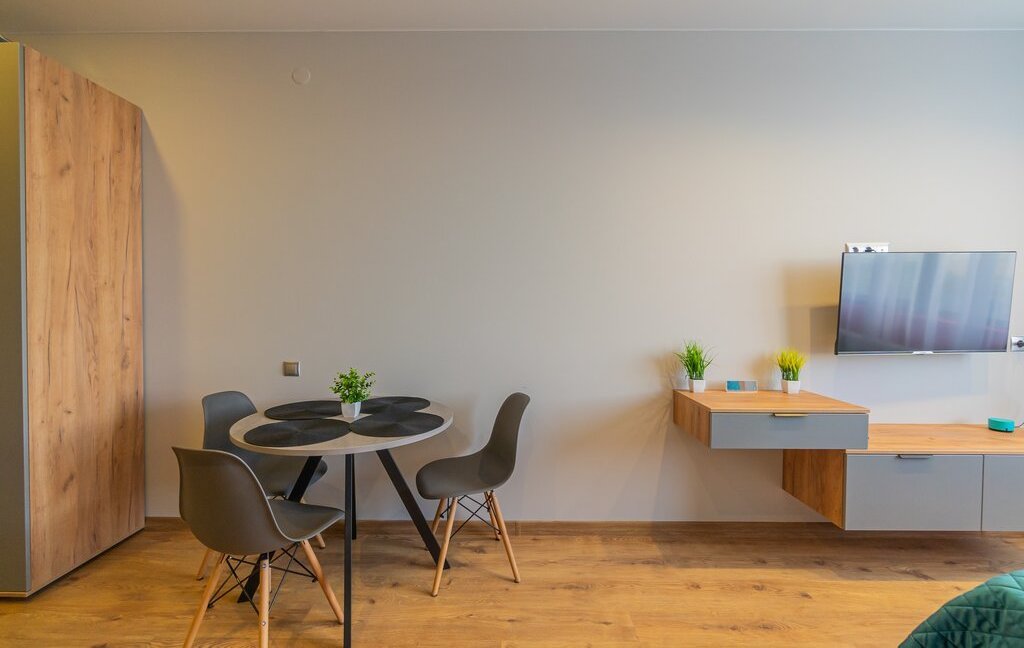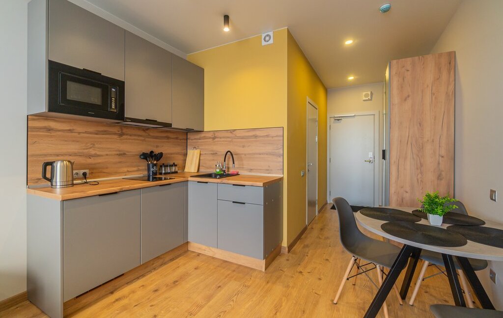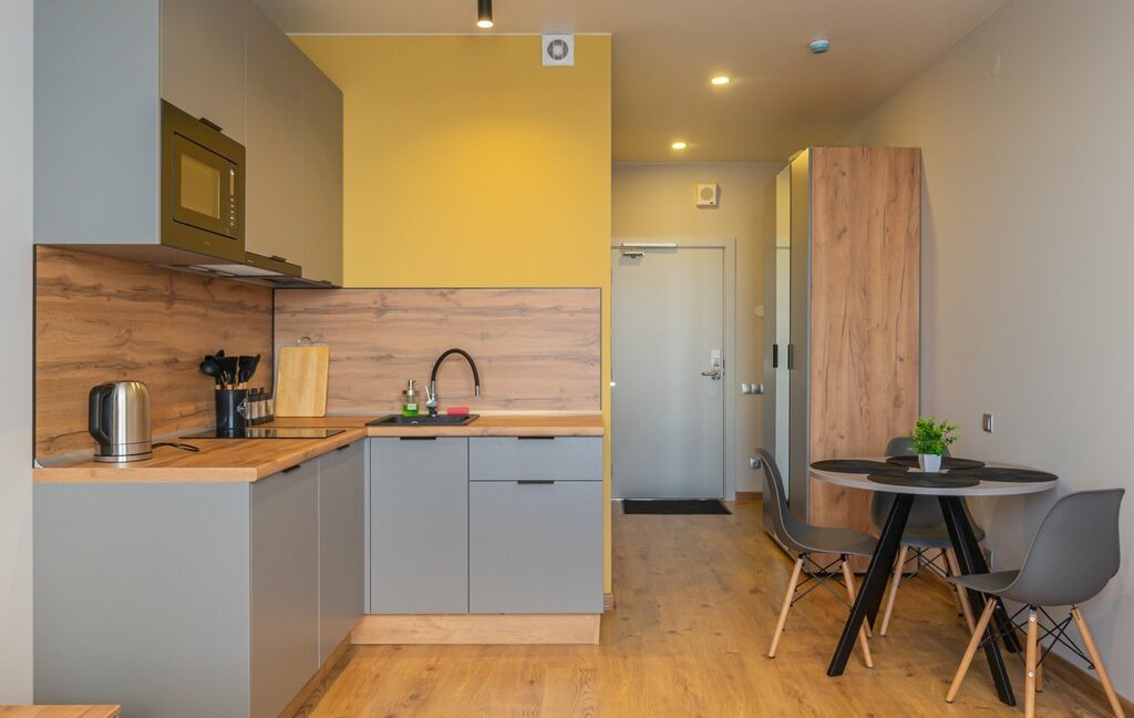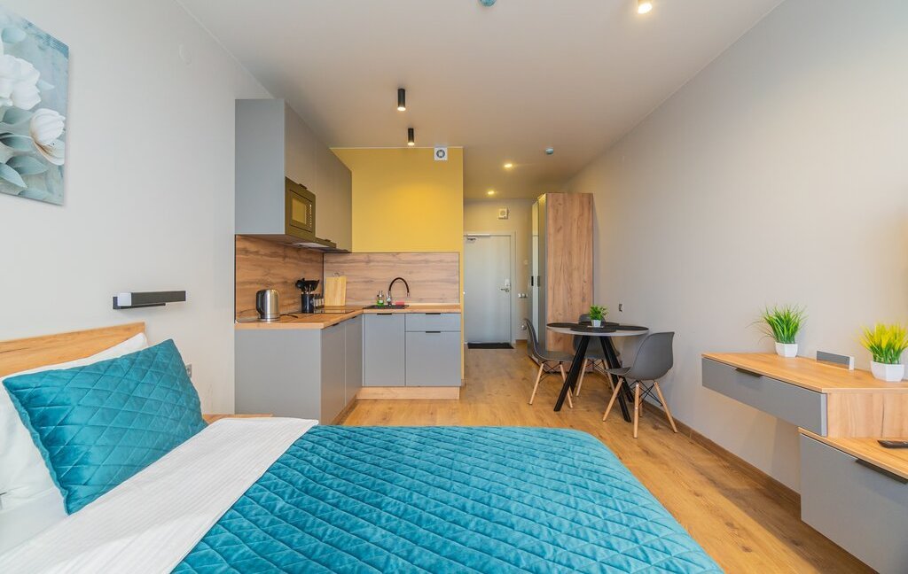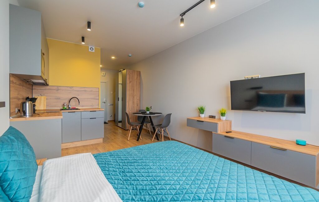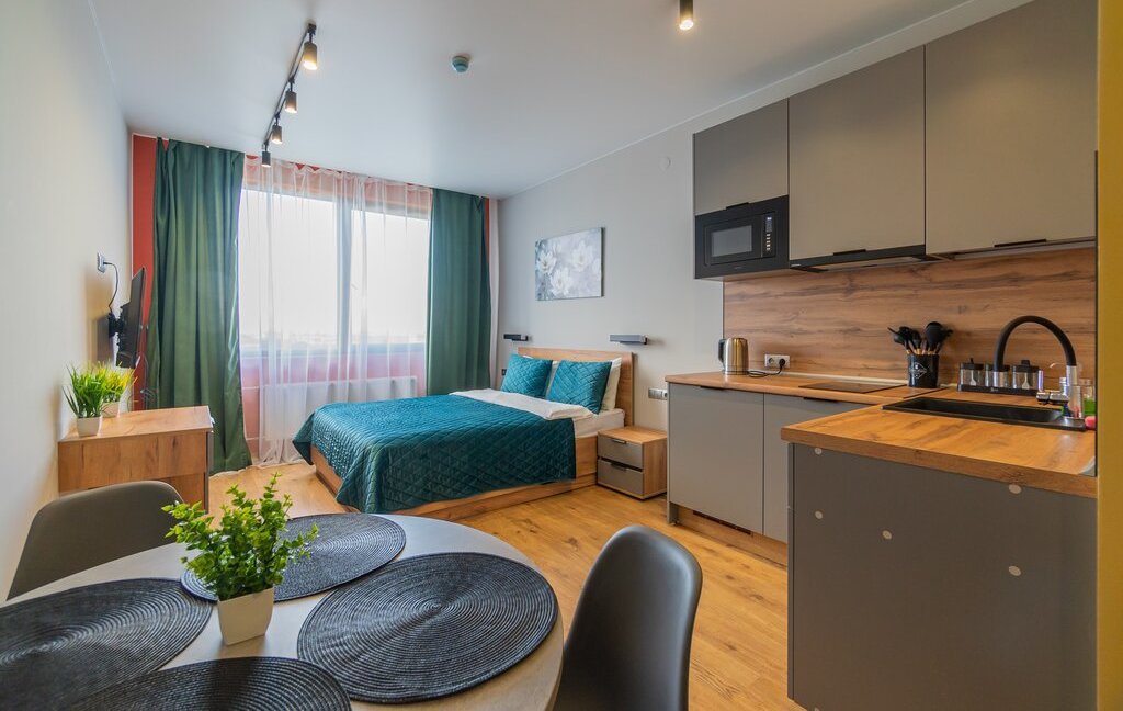 Спальня совмещена с кухонной и обеденной зоной.