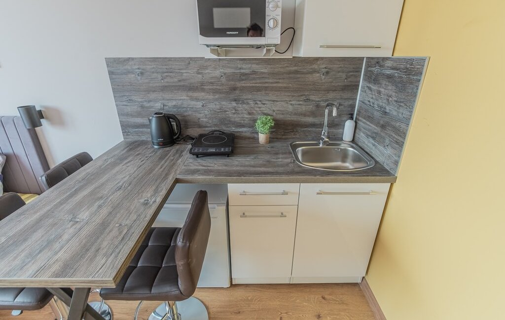 - обеденная зона (холодильник, чайник, микроволновка, плита, столовая группа, посуда на 2 персоны, стол со стульями)