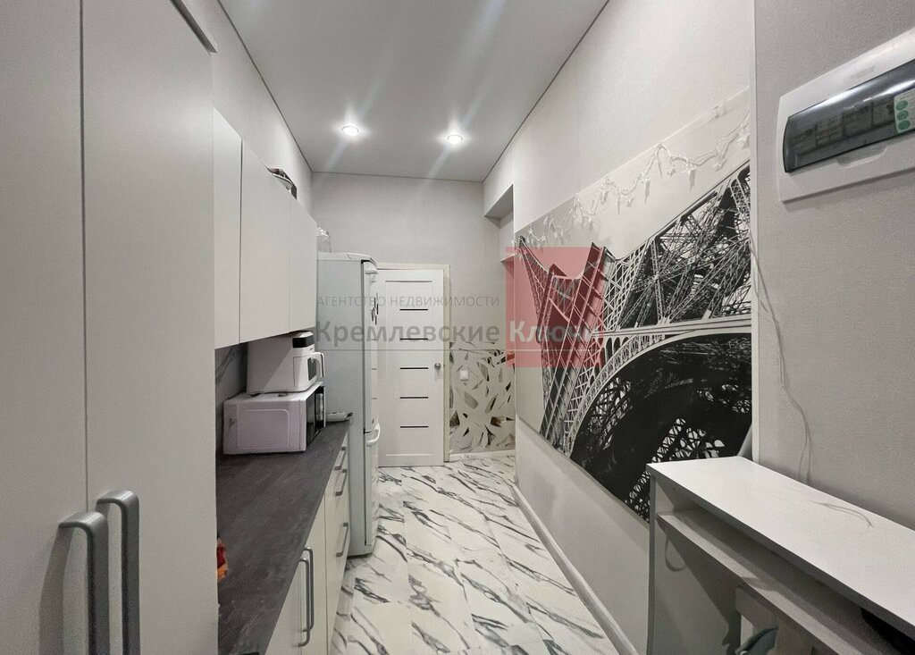 К комнате присоединена часть общего коридора, площадью 11 кв.м., что, вместе с основной комнатой 21,0 кв.м., образует полноценное приватное пространство с надежной входной дверью. Присоединение согласовано со всеми собственниками квартиры. Также организована функциональная зона с собственными совмещенным санузлом и современной кухонной линией.