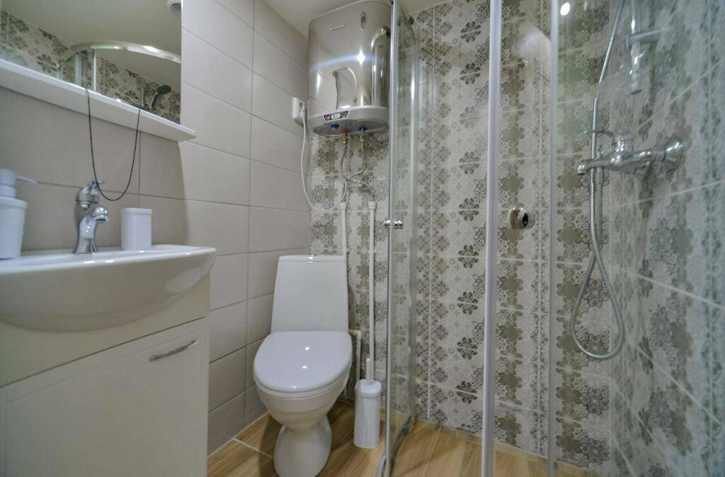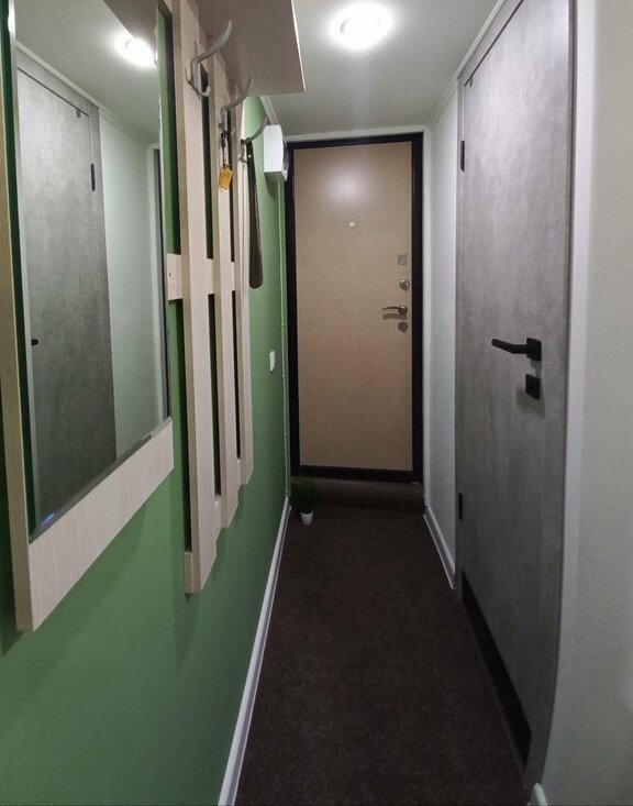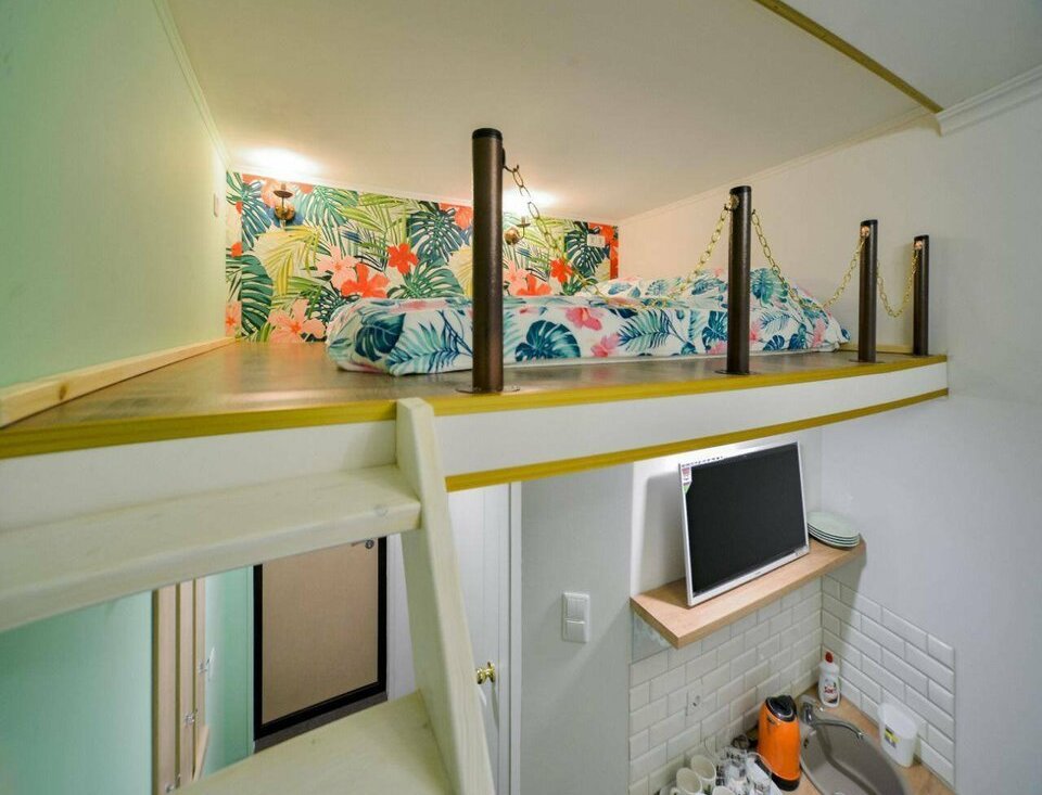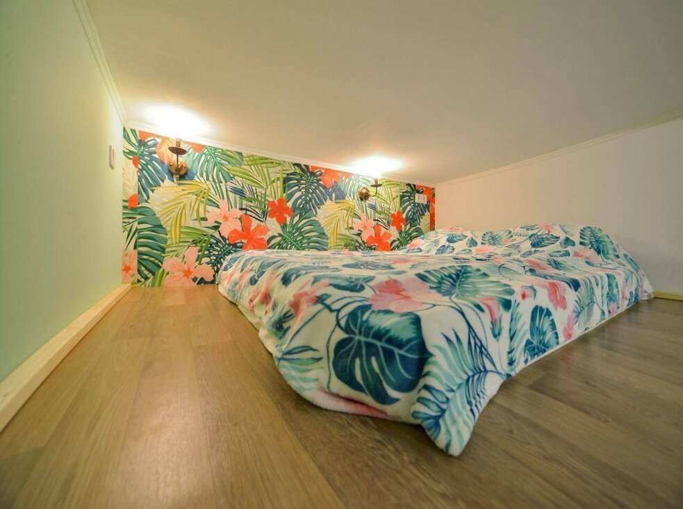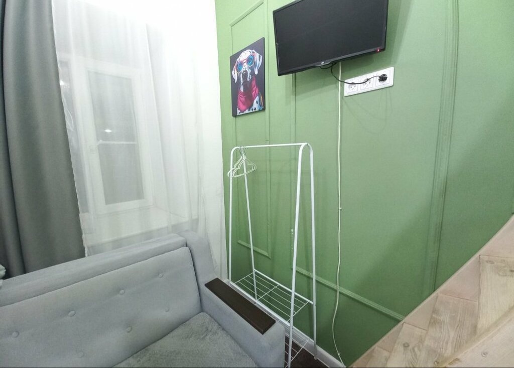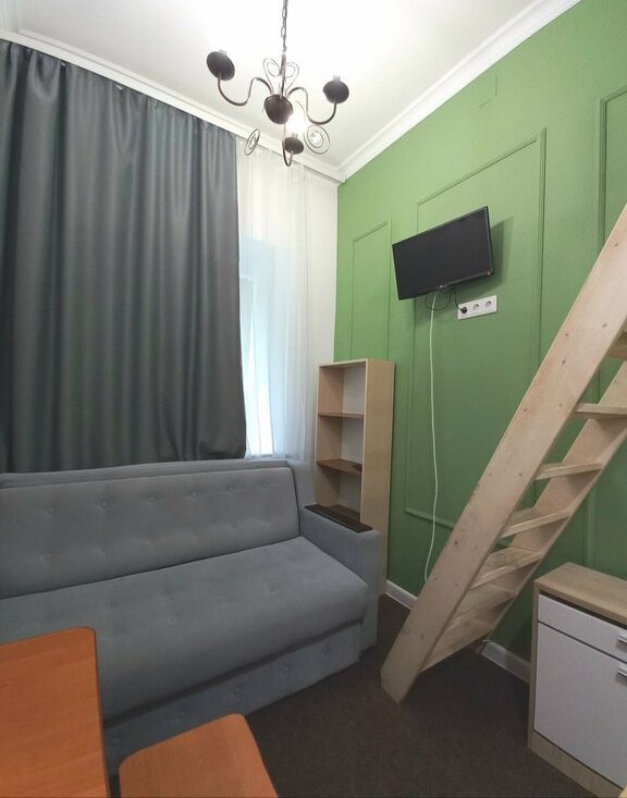 На верхнем ярусе двуспальный матрас 160×200,настенные светильники. Санузел совмещённый, оснащён душевой кабиной,водонагревателем и санузлом. Из окон открывается вид на тихий двор. В квартире установлен телевизор,есть wi-fi.