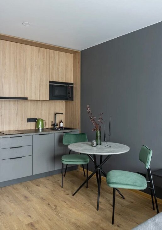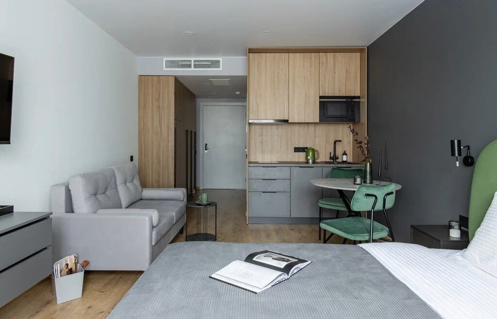 Сдается в долгосрочную аренду студия, полностью укомплектована для комфортного проживания. Встроенная техника: фильтр для очистки воды, холодильник, микроволновая печь, посудомоечная машина, кондиционирование, стиральная машина. Дополнительное спальное место - раскладной диван.