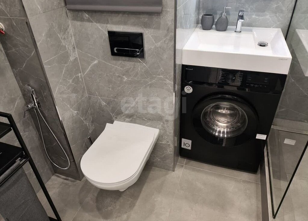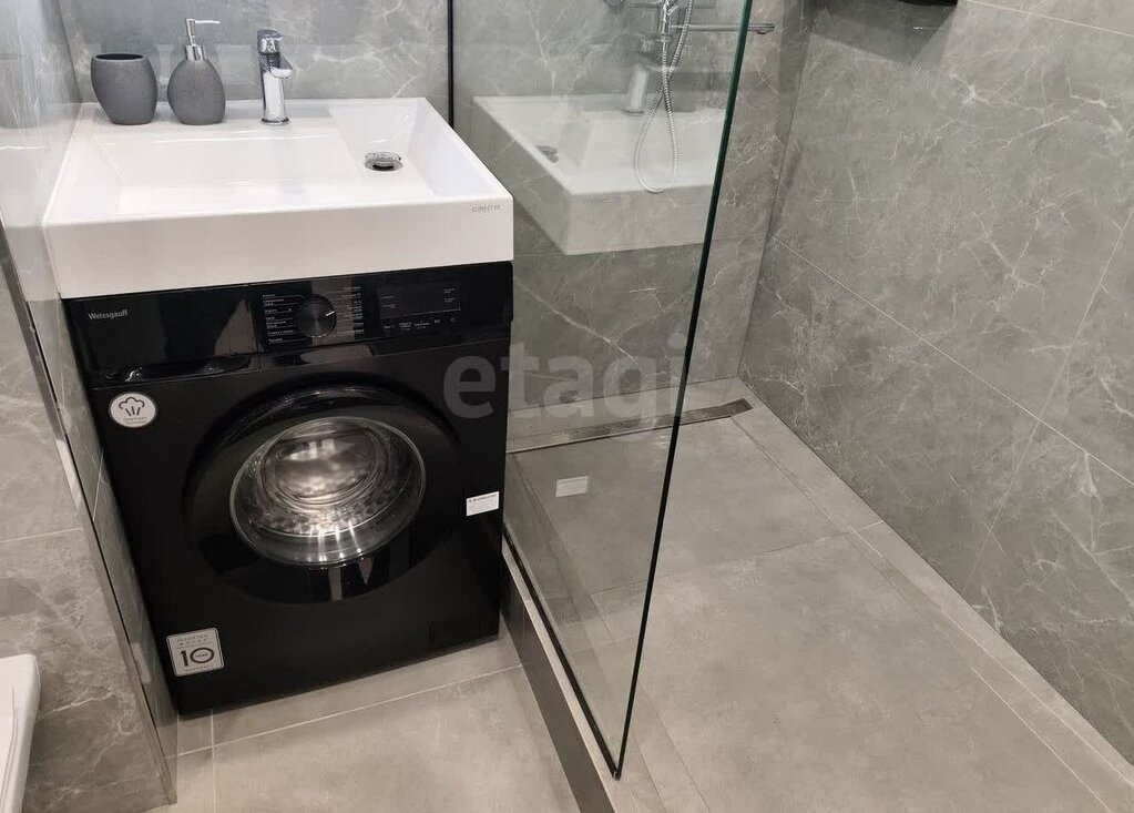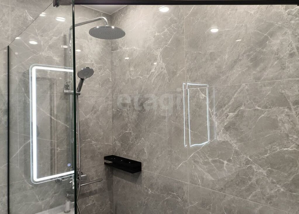 Планировка квартиры включает кухню, зону спальни и совмещенную ванную комнату с душевой кабиной.