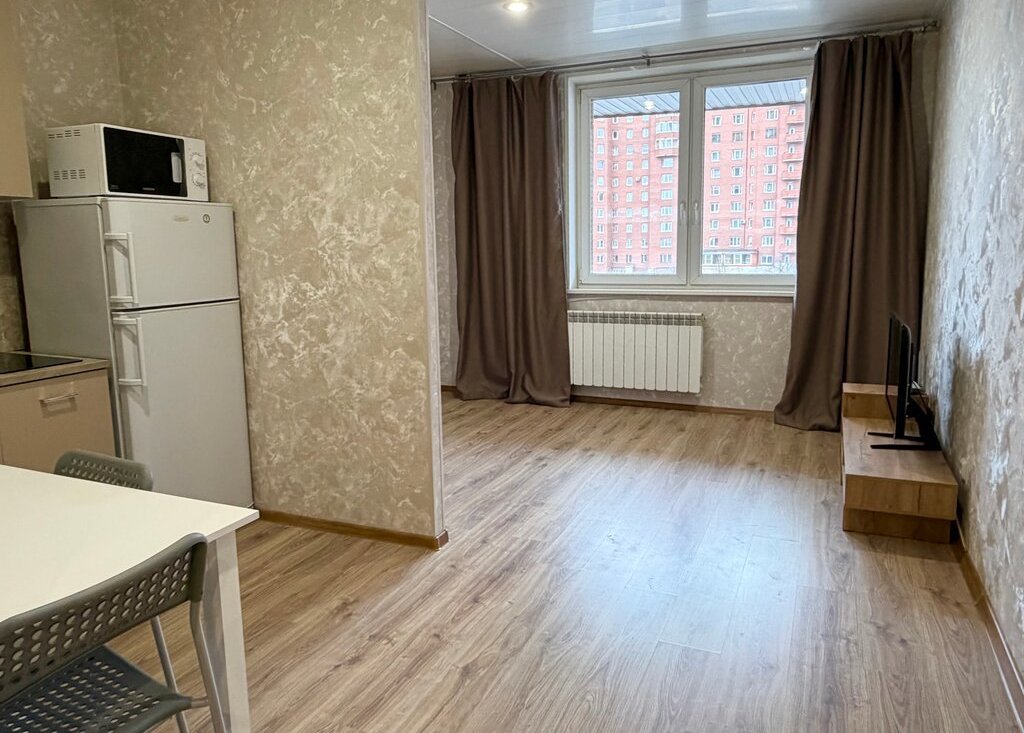 Сдается студия на длительный срок в кирпичном доме 2011 года постройки. Находится на 3 этаже из 24. В квартире выполнен свежий евро ремонт. Просторная кухня оборудована необходимой техникой: холодильник, микроволновая печь и плита. В комнате установлен телевизор и шкафы для хранения вещей.