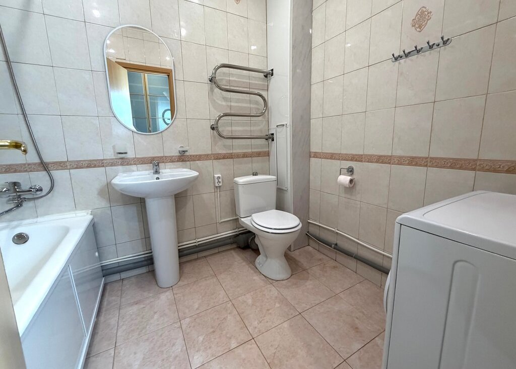 Санузел совмещенный, оснащен всем необходимым. Дом оснащён консьержем, грузовым и пассажирским лифтами. Во дворе есть детская площадка и открытая парковка. Курение разрешено, проживание с детьми можно, но с животными не допускается.