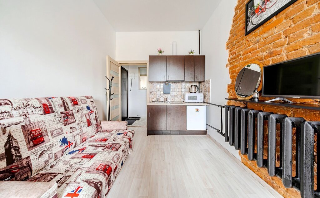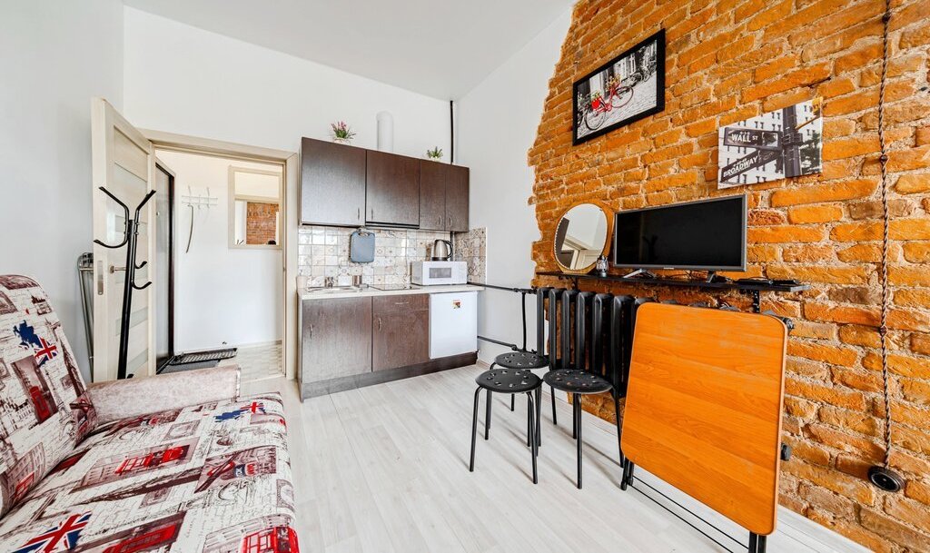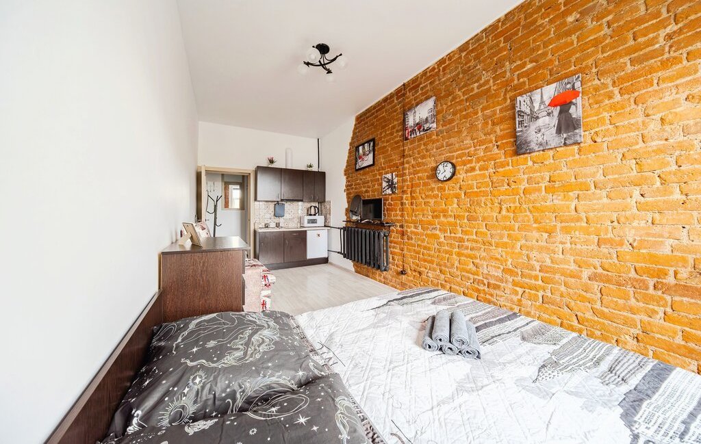 -Студия оснащена: 2х спальной кроватью, раскладной диван, раскладной стол.