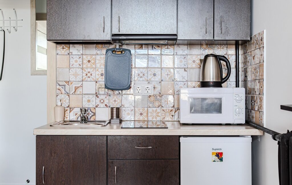 -Кухонный уголок включает в себя: холодильник, эл.варочную панель, вытяжку, микроволновку, эл.чайник, раковину, всю необходимую посуду.