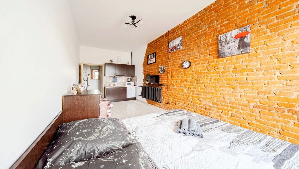 -Студия оснащена: 2х спальной кроватью, раскладной диван, раскладной стол.