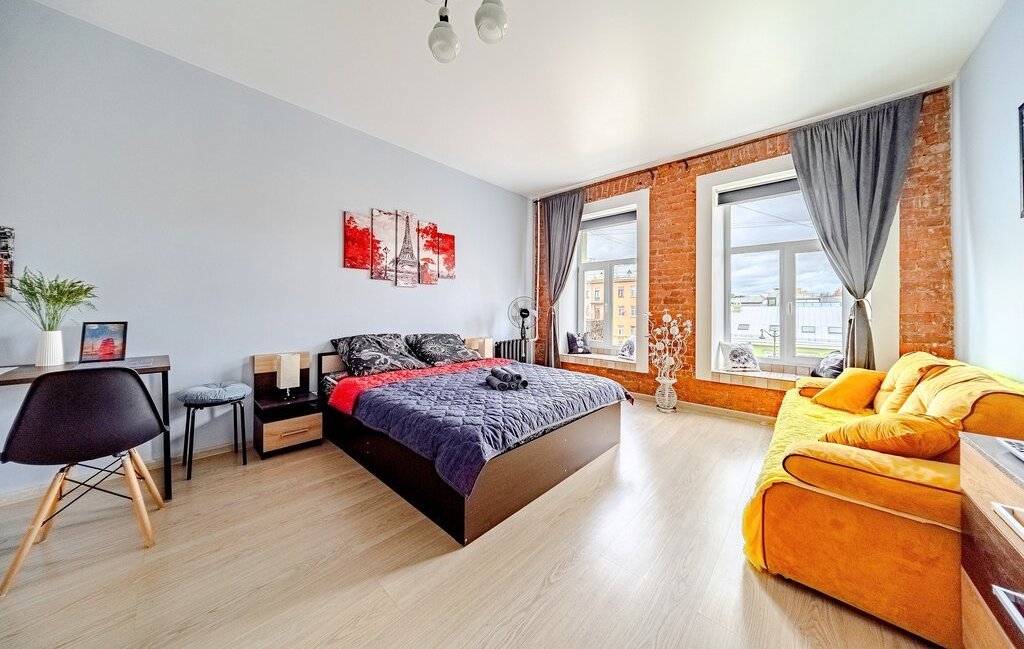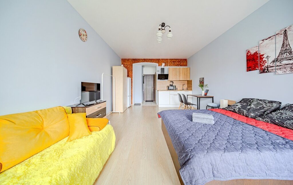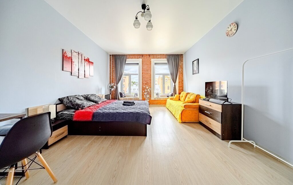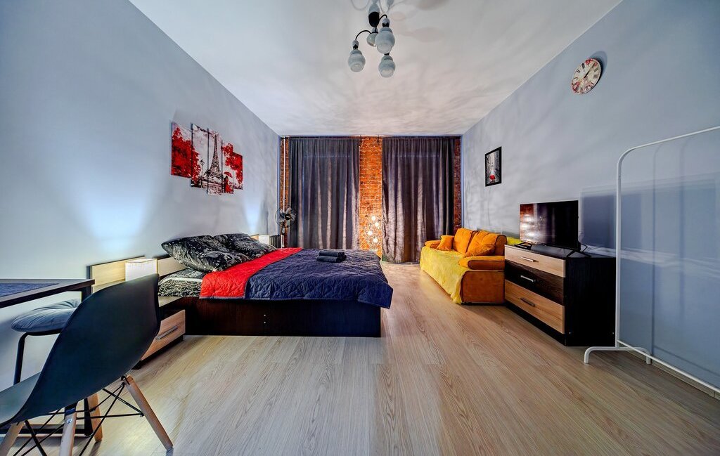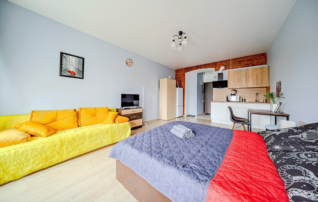 -Студия оснащена: 2х спальной кроватью, так же предусмотрено 2 дополнительных спальных места на большом раскладном диване. Есть телевизор, Wi-Fi, места для хранения (шкаф, комод, тумбочки). С/У совмещенный.