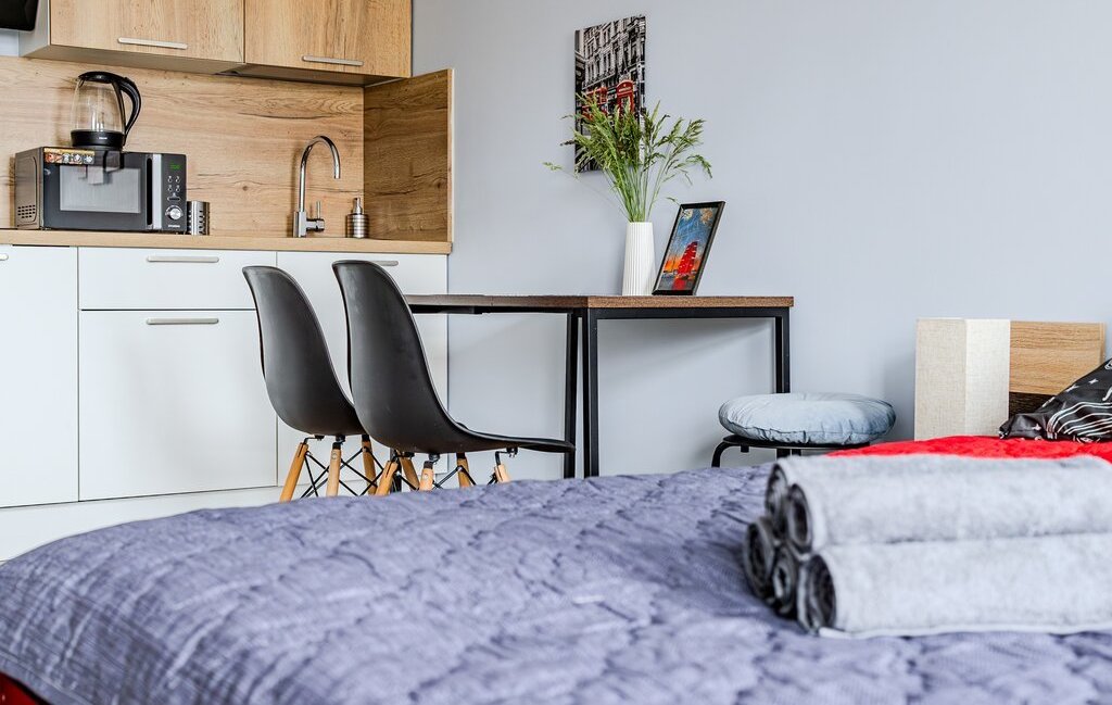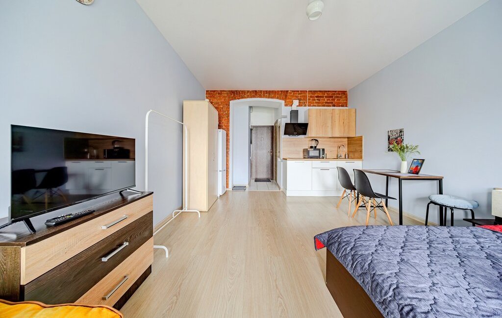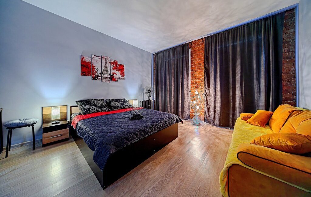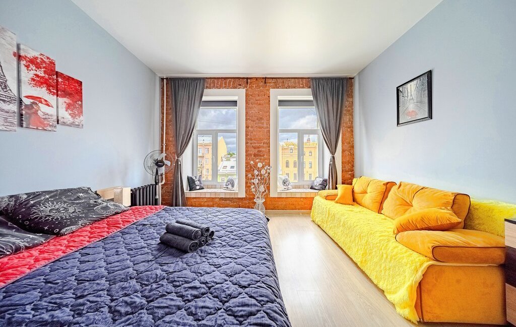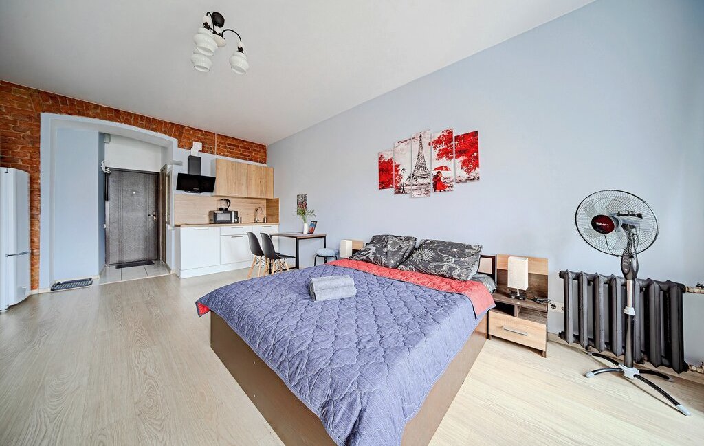 -Студия оснащена: 2х спальной кроватью, так же предусмотрено 2 дополнительных спальных места на большом раскладном диване. Есть телевизор, Wi-Fi, места для хранения (шкаф, комод, тумбочки). С/У совмещенный.