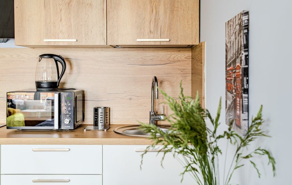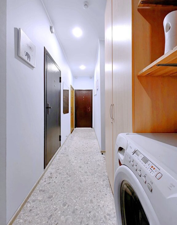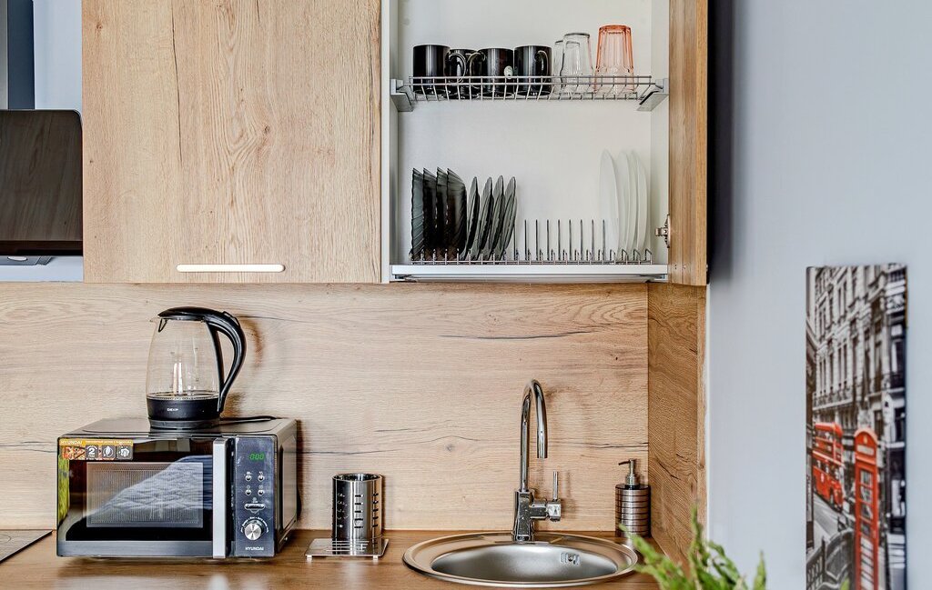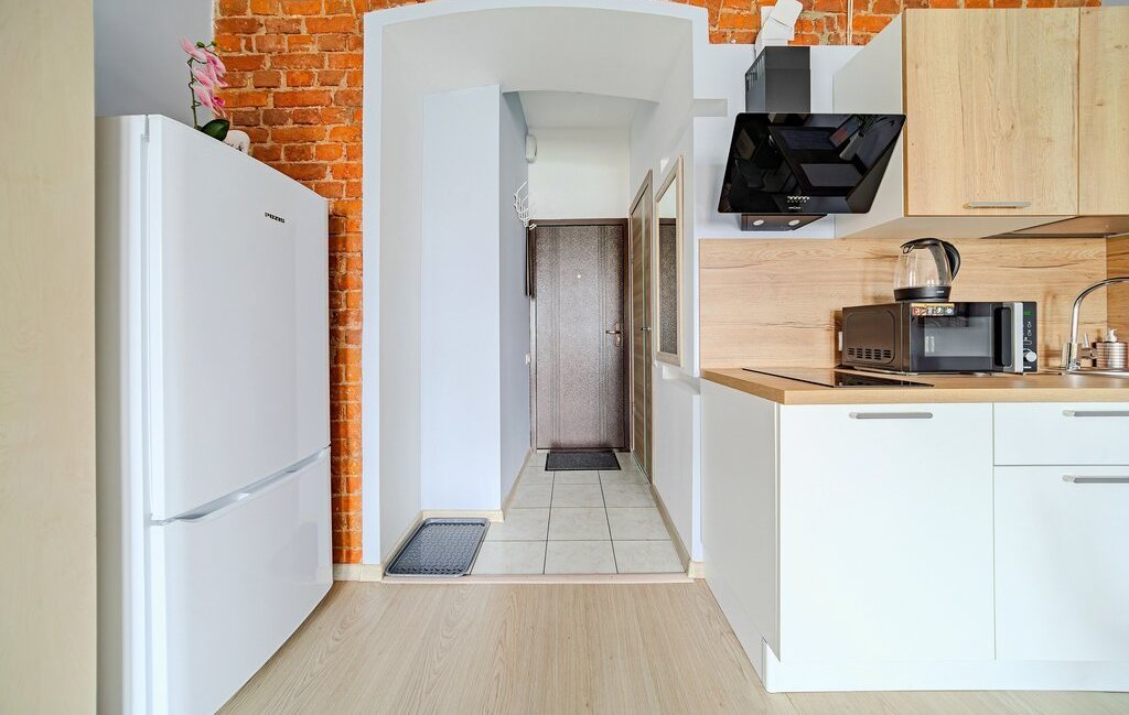 -Кухонный уголок включает в себя: холодильник, эл.варочную панель, вытяжку, микроволновку, эл.чайник, раковину, систему фильтрации воды, всю необходимую посуду.