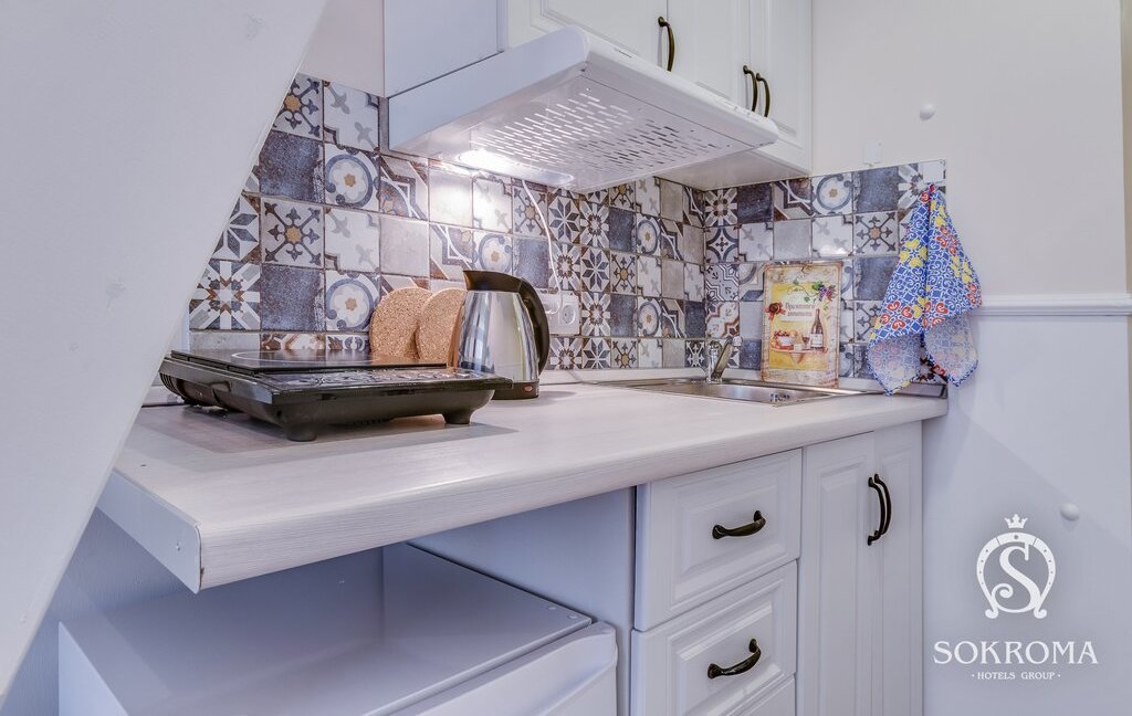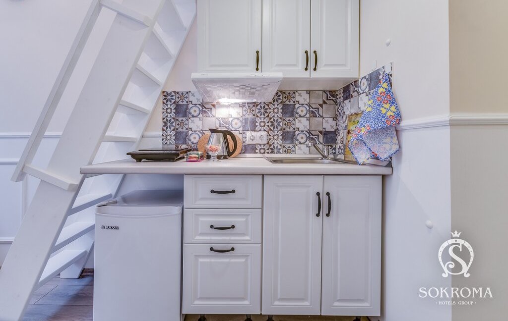 В студии чайник, индукционная плита ,холодильник. На общей территории расположена гладильная доска, стиральная машина, микроволновая печь, кулер - доступные для пользования