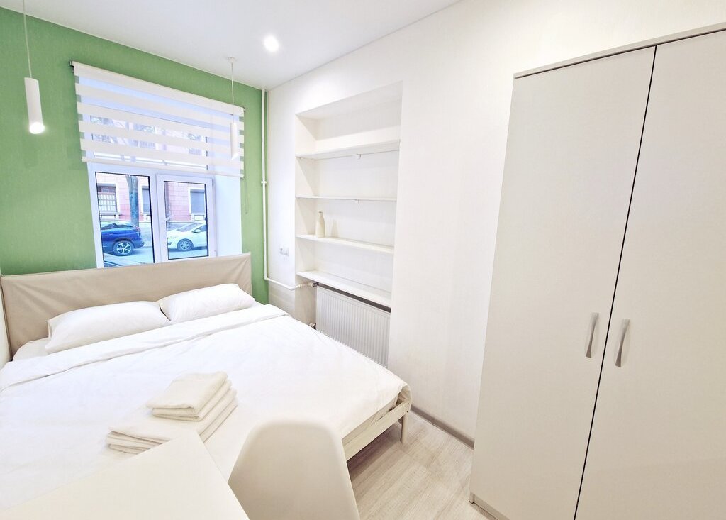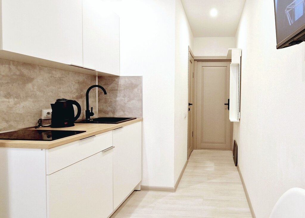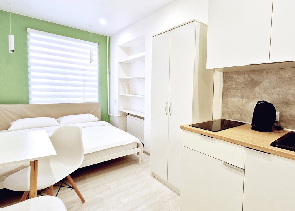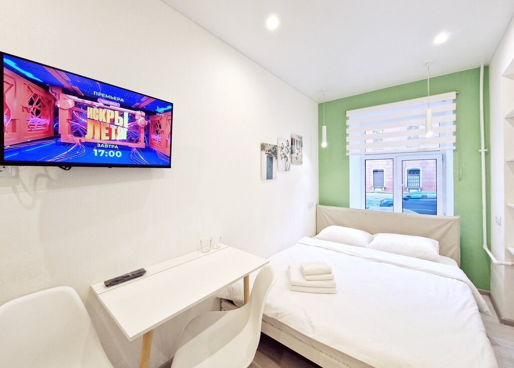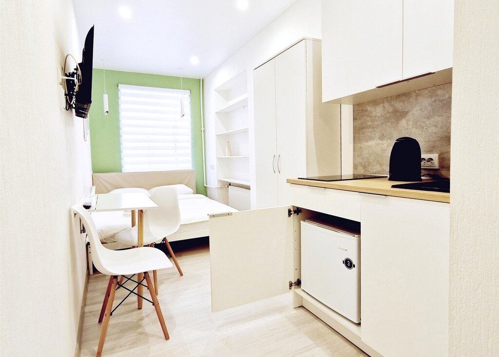 - Для комфортного проживания в студии имеется мини кухня с холодильником, чайником, СВЧ печью и электрической варочной панелью, в комнате установлена вся необходимая мебель с очень удобной двухспальной кроватью шириной 160 см. с качественным ортопедическим жестким матрасом и чистым постельным бельем, есть ЖК телевизор с цифровыми каналами.