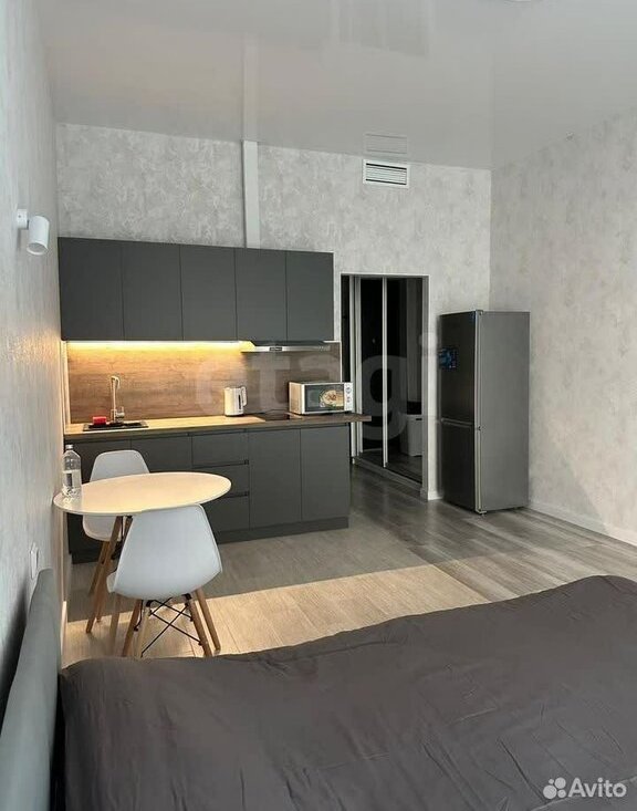 Просторная планировка квартиры включает оборудованную техникой кухню, спальную зону, ванную комнату с теплым полом.